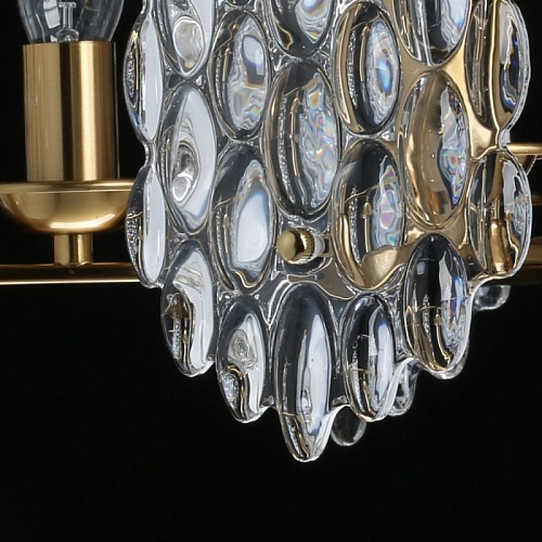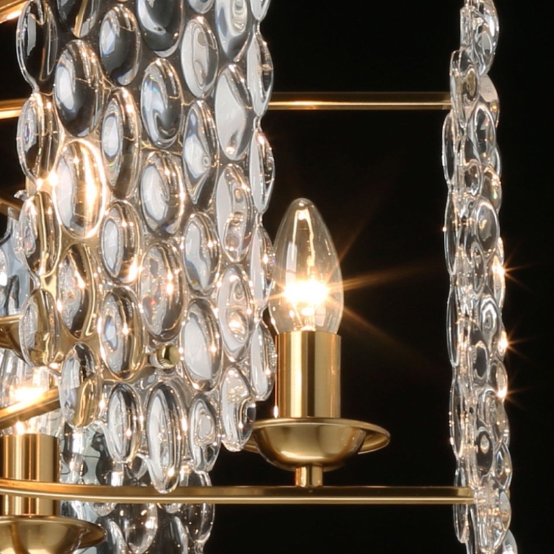 Металлическое основание подвесной люстры гальванизировано в цвет латуни. Источники света закрыты плафонами в виде пластин из фактурного стекла с крупным упорядоченным орнаментом фактуры. Центральная часть люстры декорирована прозрачными массивами хрусталя ручной калибровки.