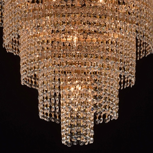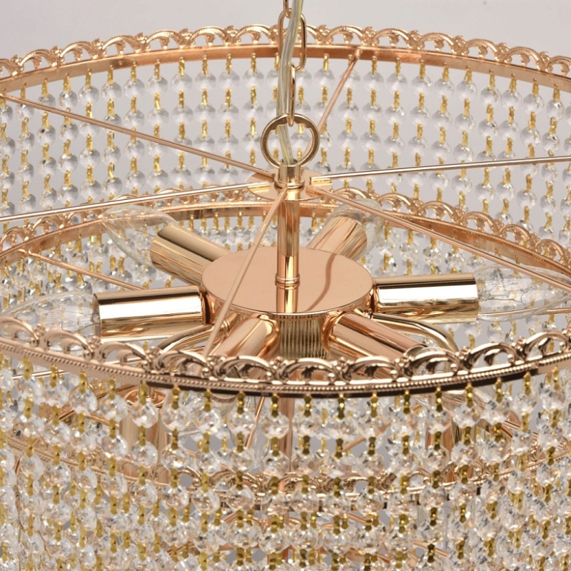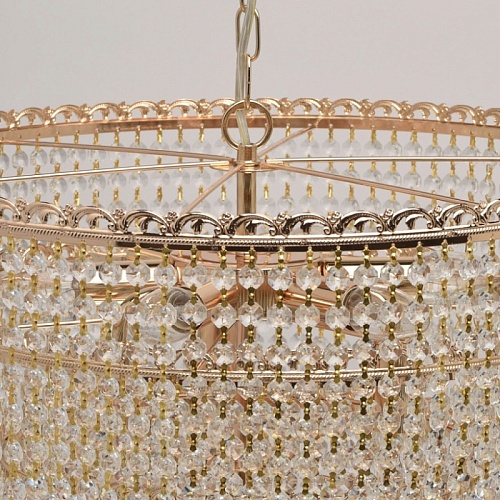Основание: металл, гальванизация в цвет французского золота. Плафон: металлический каркас в цвет основания, декорирован подвесками прозрачного хрусталя формы октагона. Декор: чеканка на каркасе, папильоны в цвет арматуры.