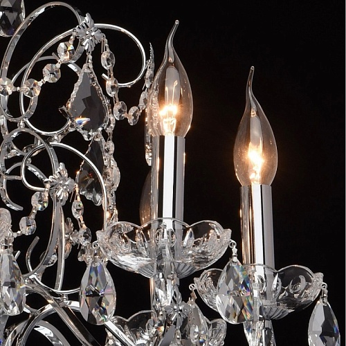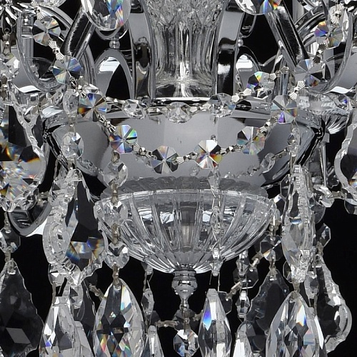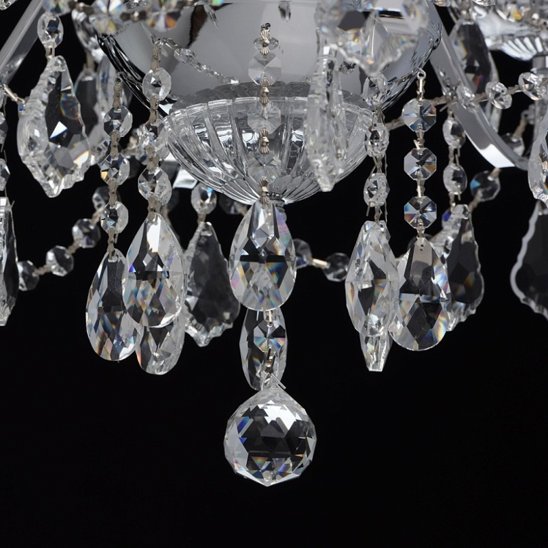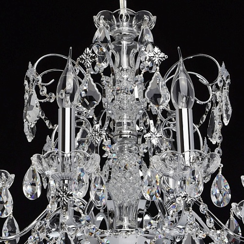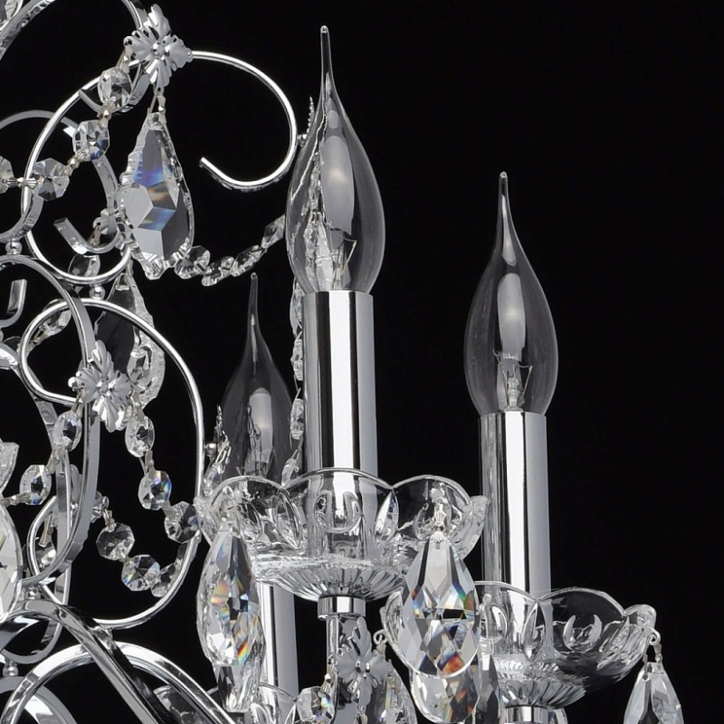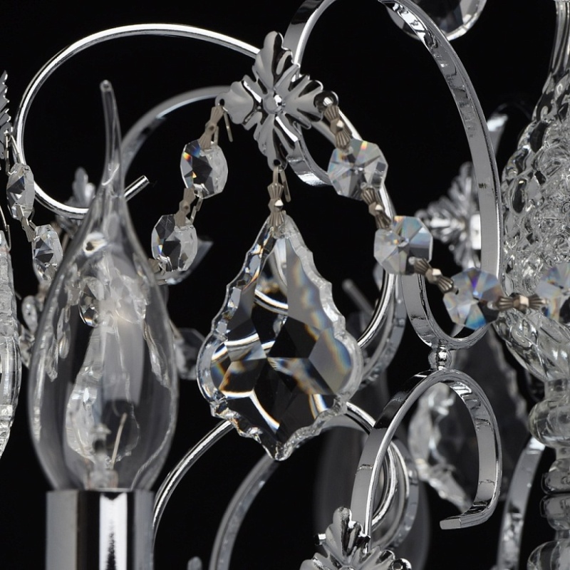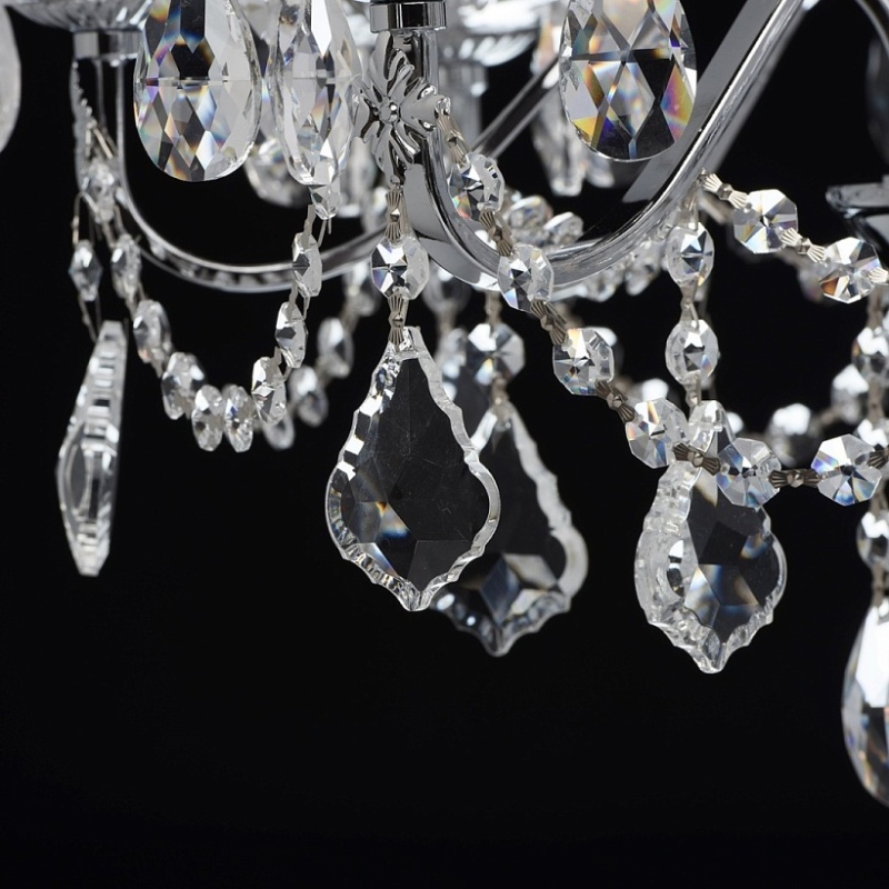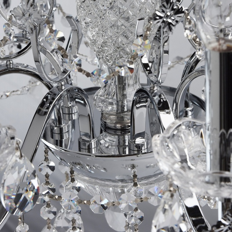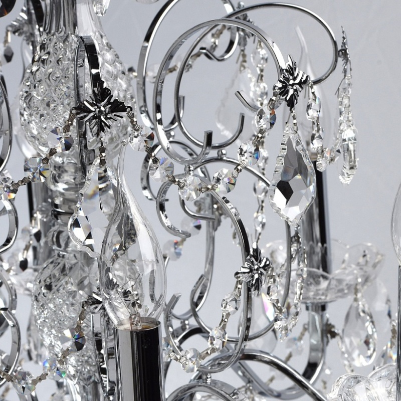 Арматура светильника выполнена из сплава железа и гальванизирована в цвет хрома. Центральная ось декорирована прозрачным стеклом со сложным орнаментом. Розетки выполнены из прозрачного стекла, отлитого по форме. Светильник декорирован хрустальными подвесками 4-х видов: октагон, миндаль, дубовый лист, шар.