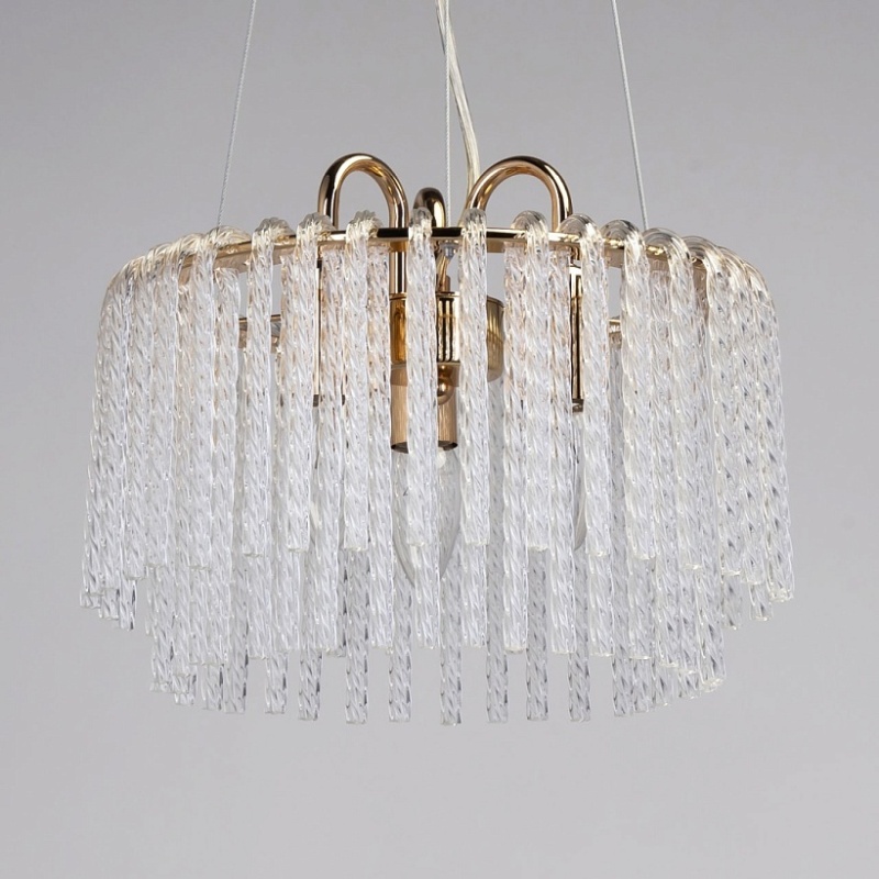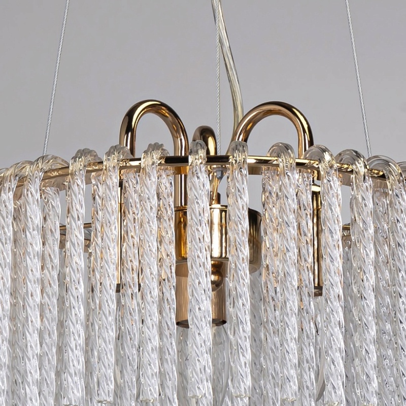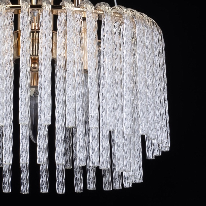 Металлическое основание подвесной люстры гальванизировано в цвет золота. Светильник декорирован прозрачными стеклянными извитыми элементами.
