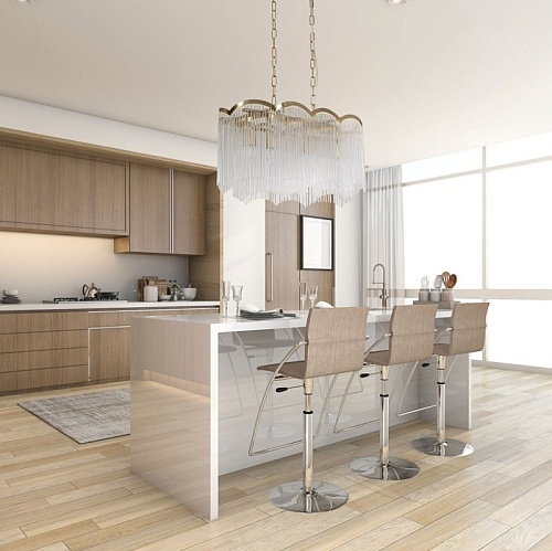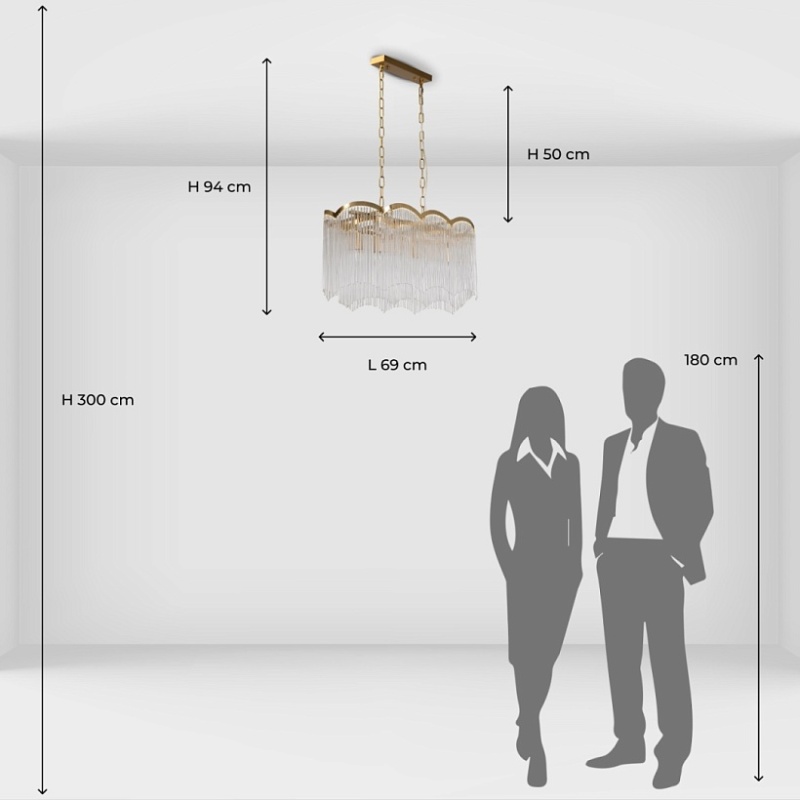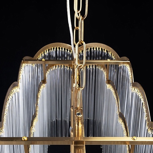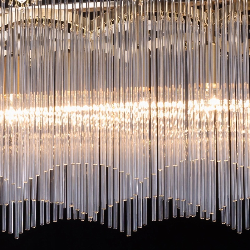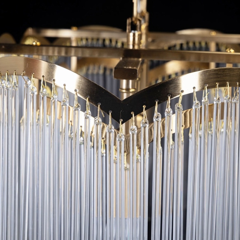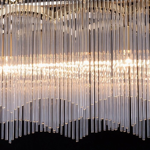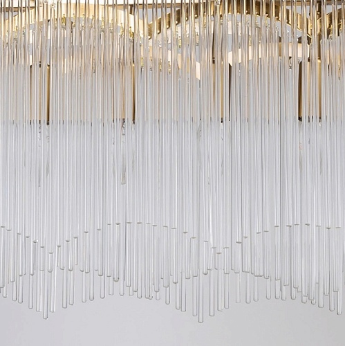 Металлическое основание потолочной люстры гальванизировано в цвет латунь. Люстра декорирована прозрачными стеклянными трубочками.