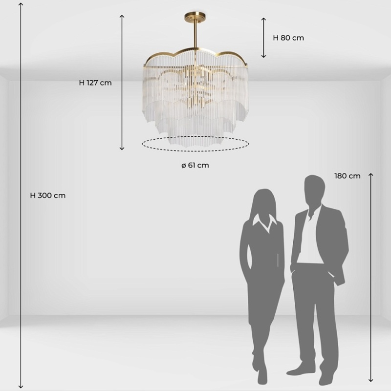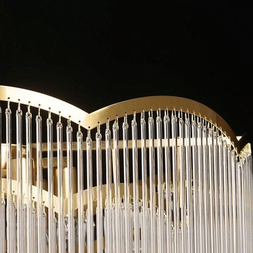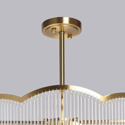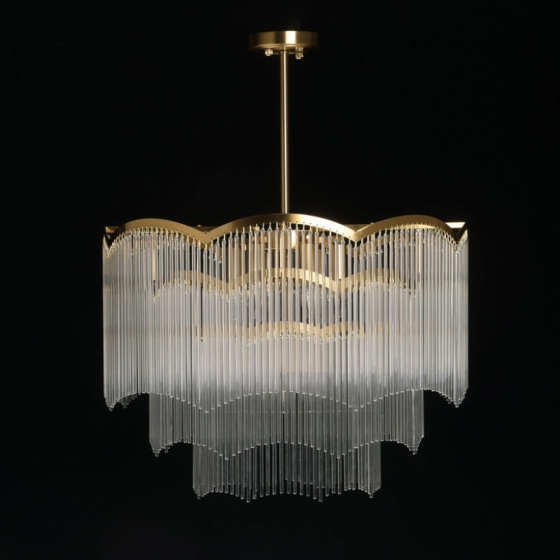 Металлическое основание подвесной люстры гальванизировано в цвет латуни. Люстра декорирована прозрачными стеклянными трубочками.