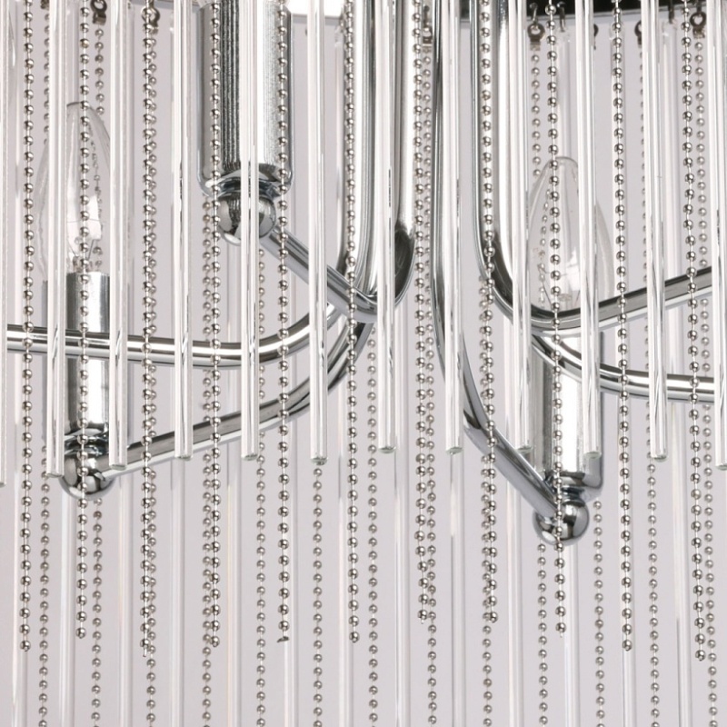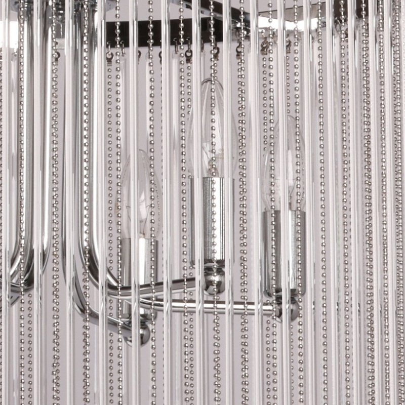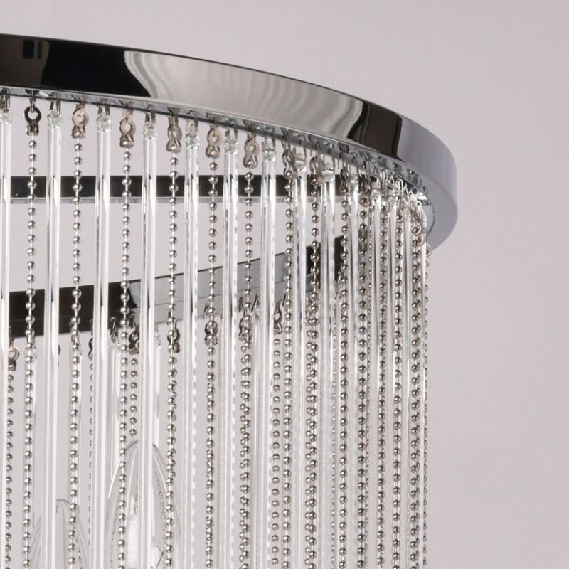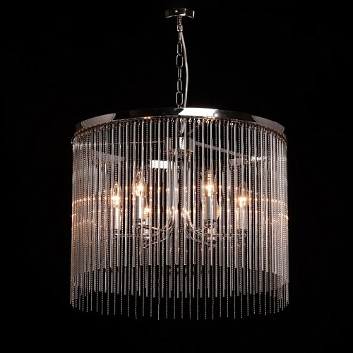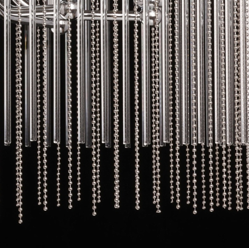 Металлическое основание подвесной люстры гальванизировано в цвет хрома. Светильник декорирован прозрачными стеклянными трубочками и металлическими цепочками, гальванизированными в цвет основания.