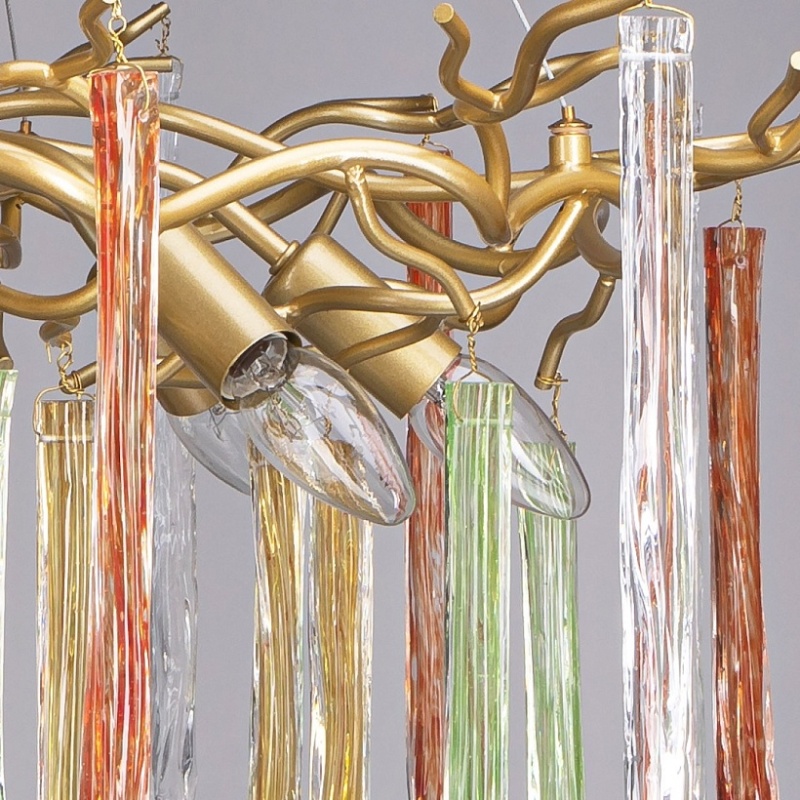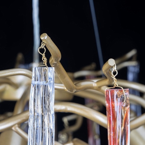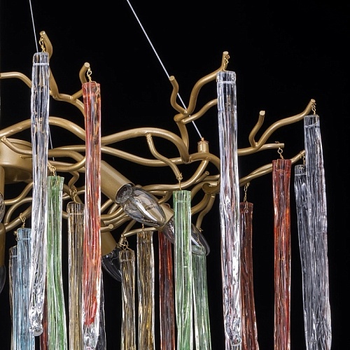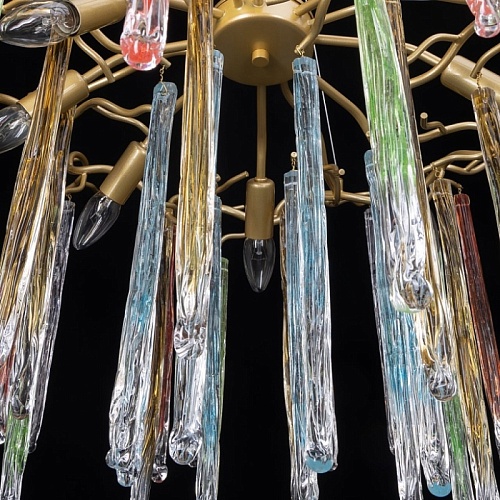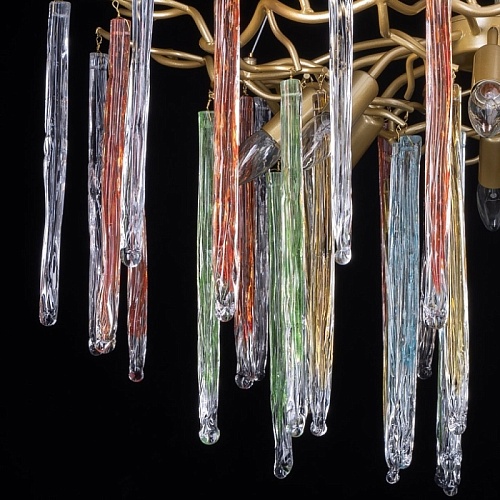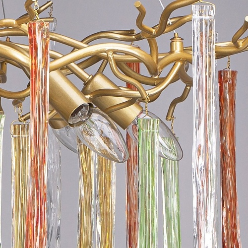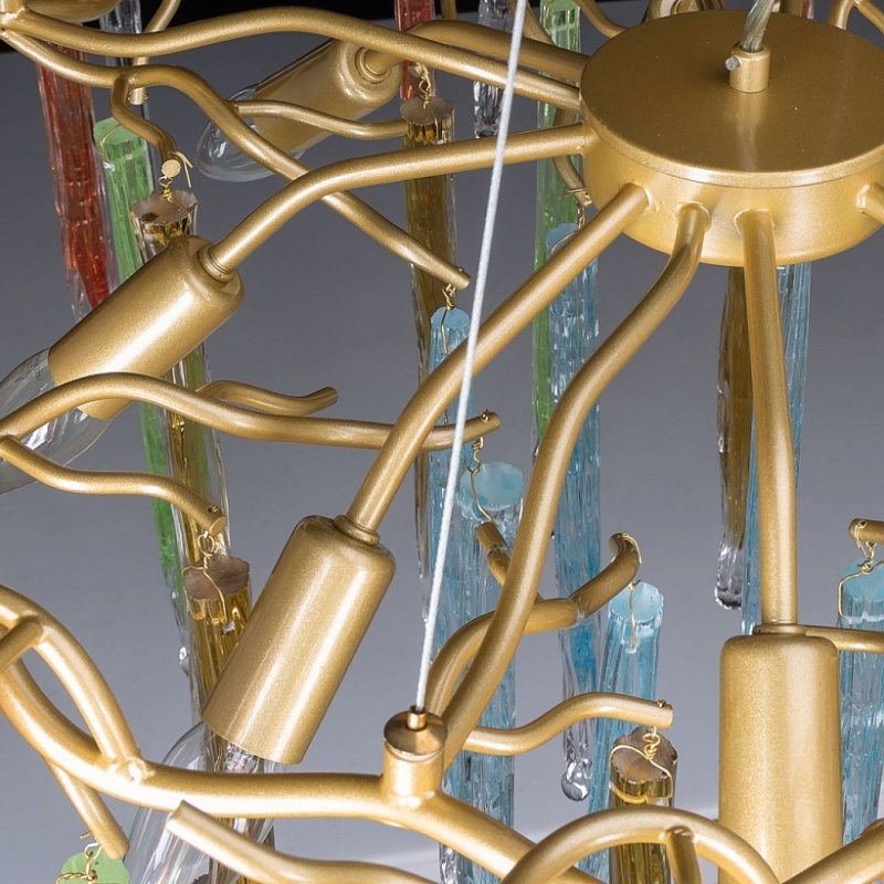 Металлическое основание светильника окрашено в цвет перламутрового золота. Люстра на тросах декорирована стеклянными элементами вытянутой формы, прозрачными и окрашенными в массе в красный, зеленый, голубой и желтый цвета.