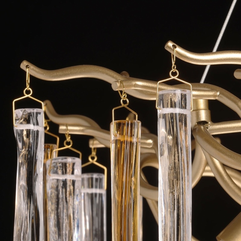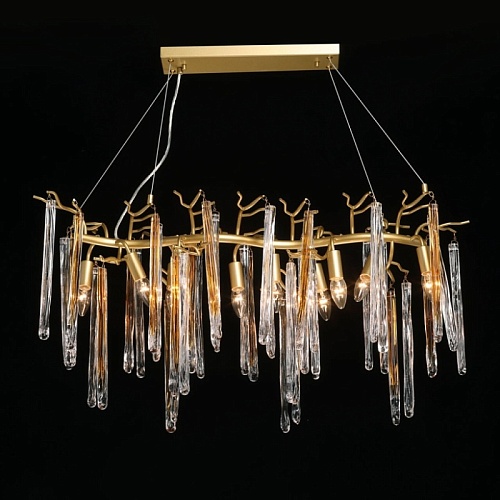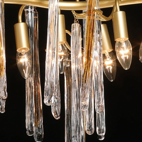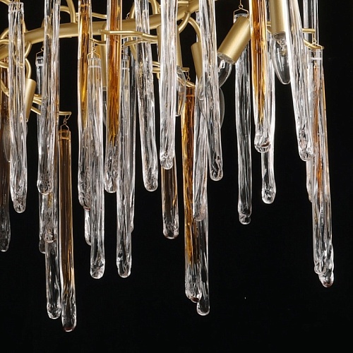 Металлическое основание подвесной люстры окрашено в цвет перламутрового золота. Люстра декорирована прозрачными стеклянными подвесками и подвесками, окрашенными в цвет карамели.