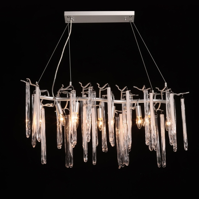 Металлическое основание подвесной люстры окрашено в цвет перламутрового серебра. Люстра декорирована прозрачными стеклянными подвесками и подвесками, окрашенными в белый цвет.