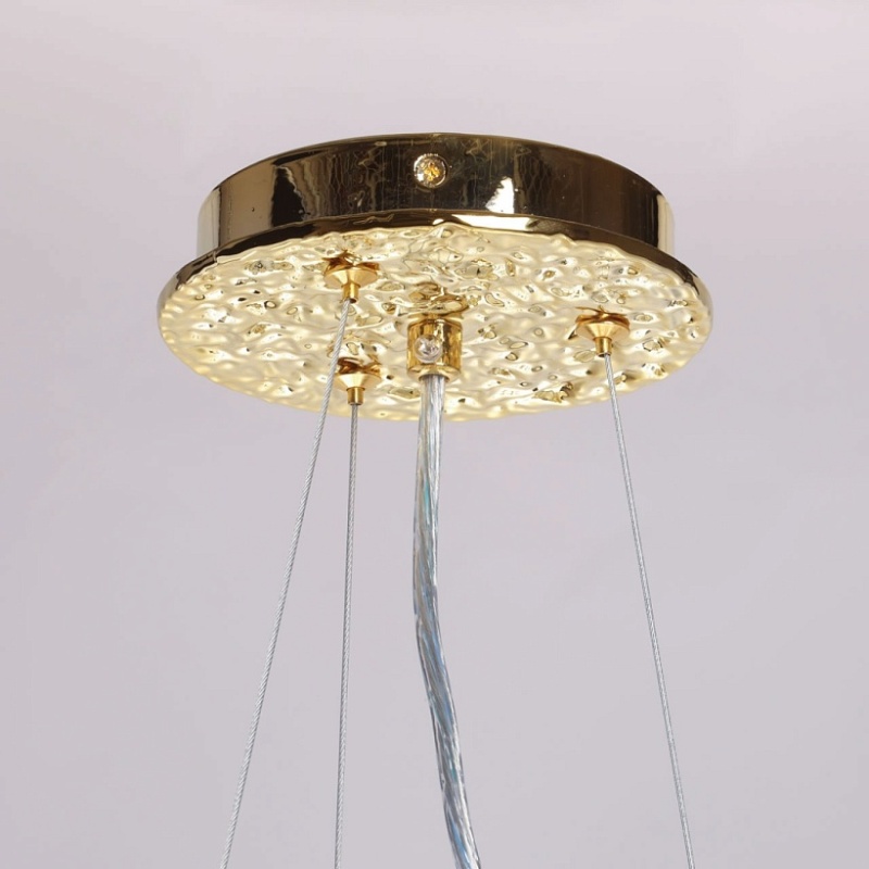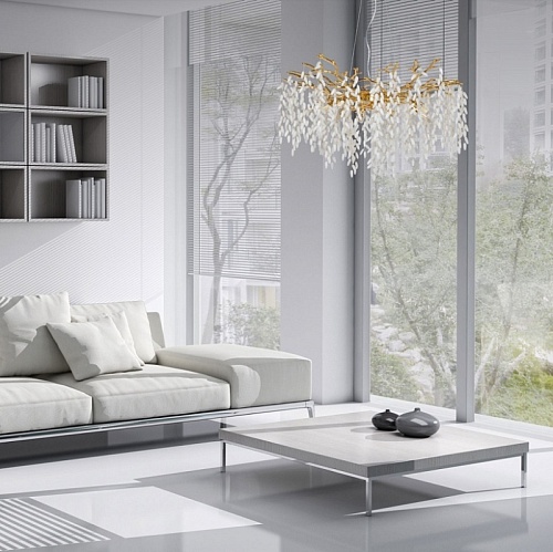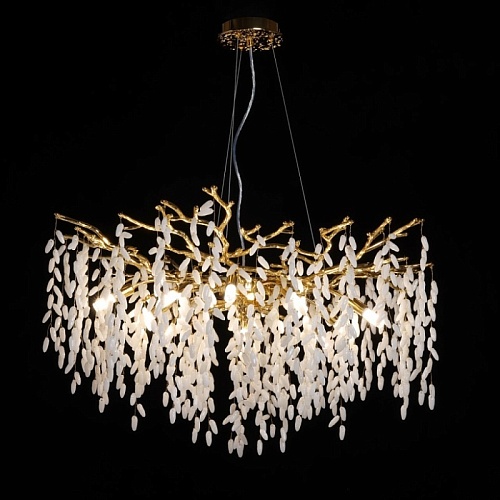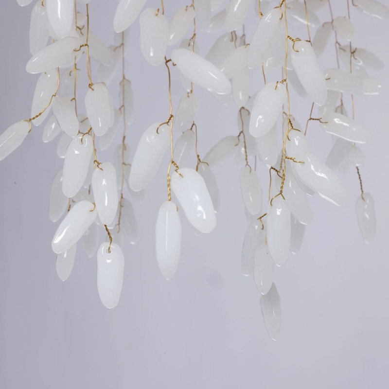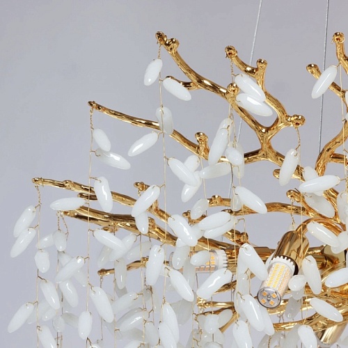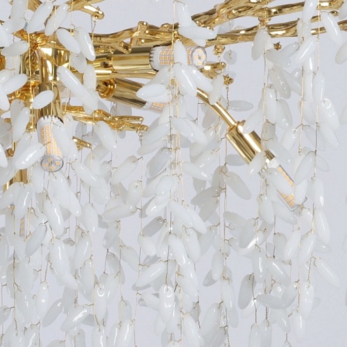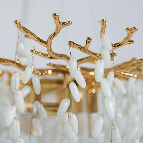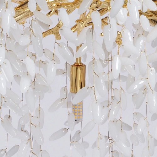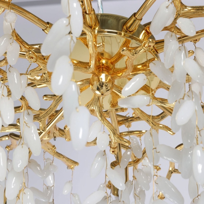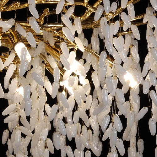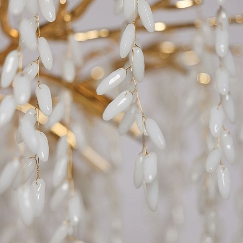 Основание подвесной люстры выполнено по технологии художественного литья из сплава алюминия с цинком и гальванизировано в цвет золота. Потолочная чаша закрыта фактурным художественным литьем. Люстра декорирована гроздьями из белого матового стекла.