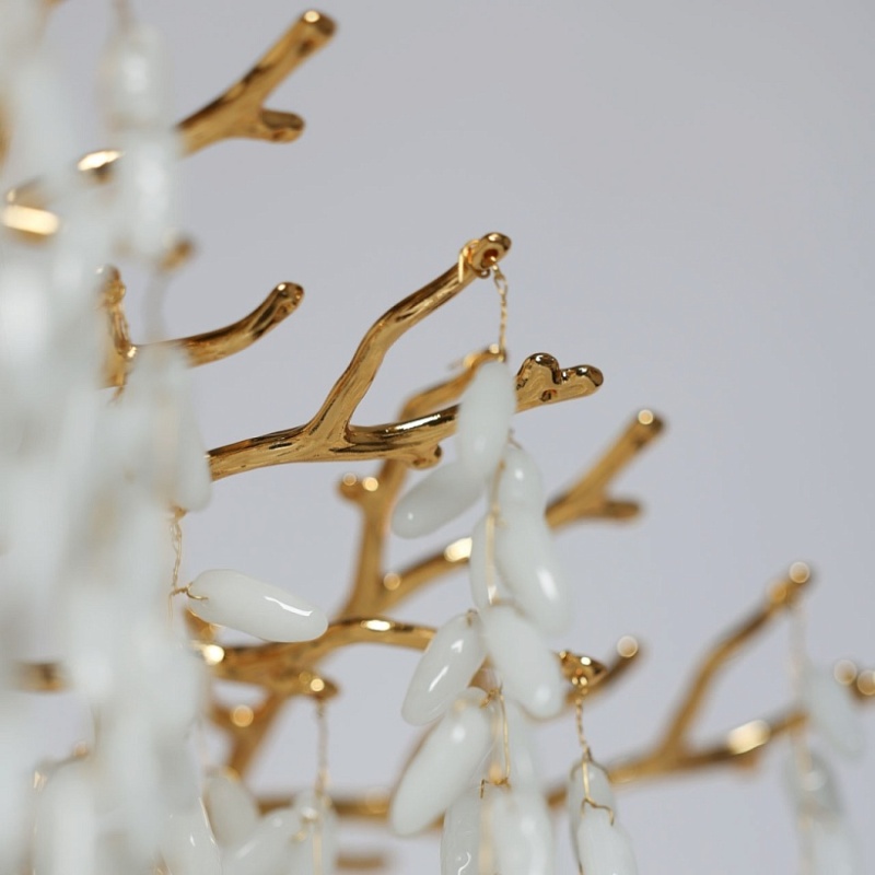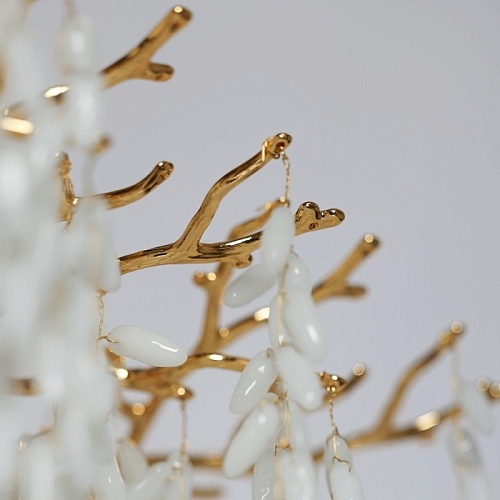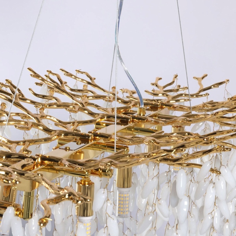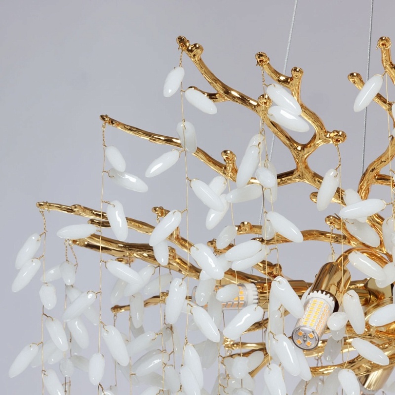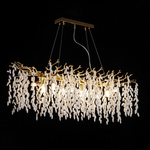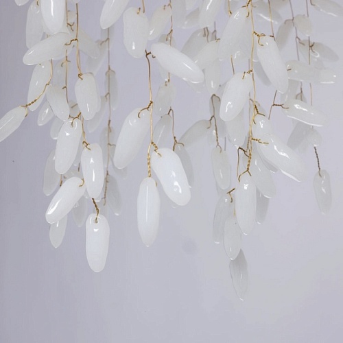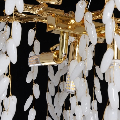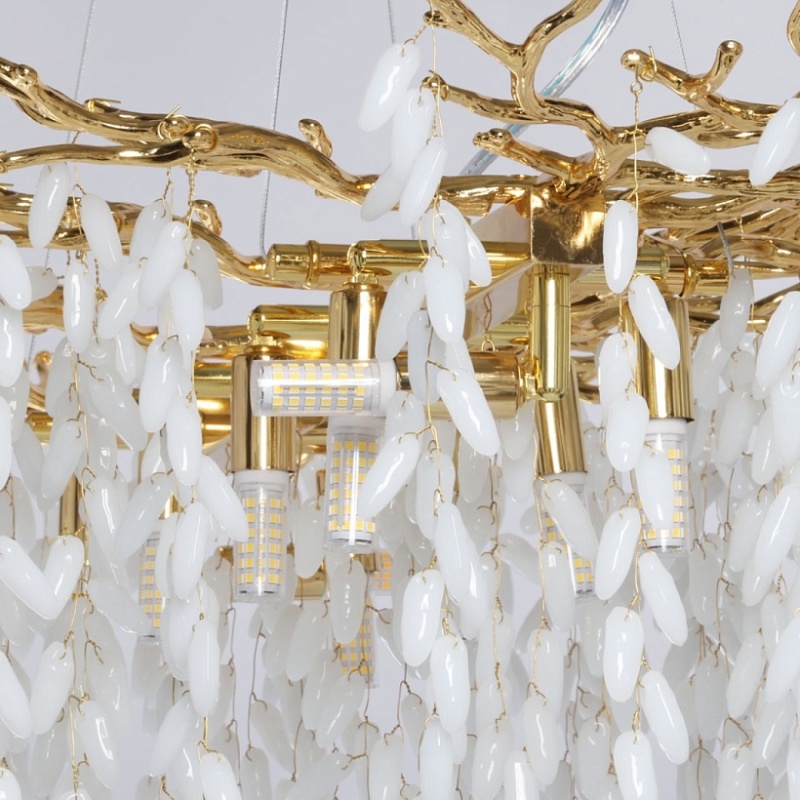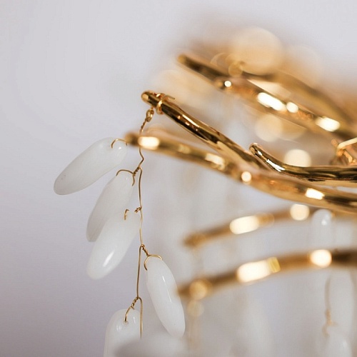 Основание подвесной люстры выполнено по технологии художественного литья из сплава алюминия с цинком и гальванизировано в цвет золота. Люстра декорирована гроздьями из белого матового стекла.