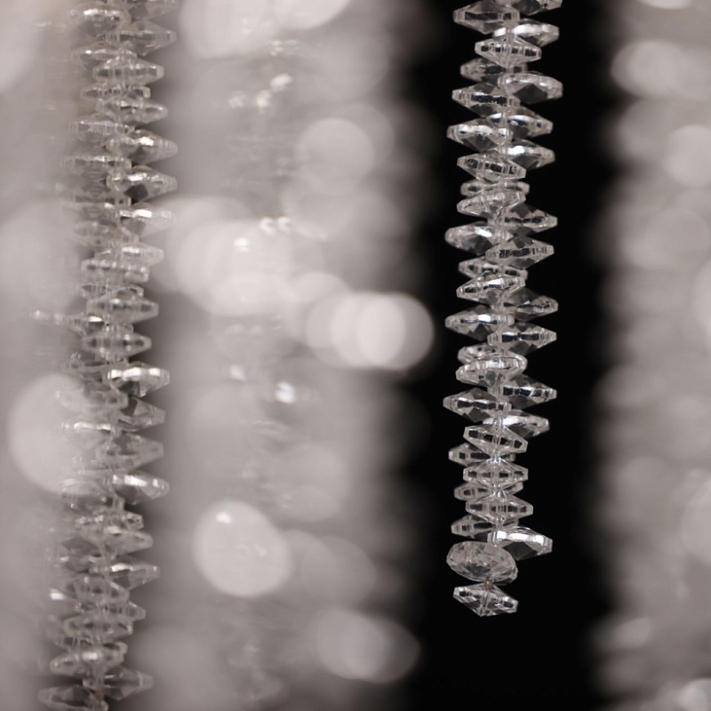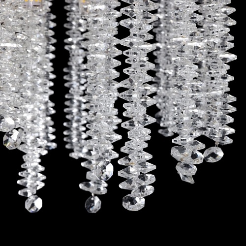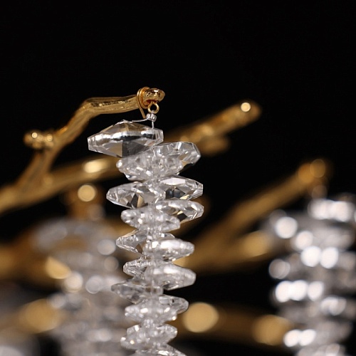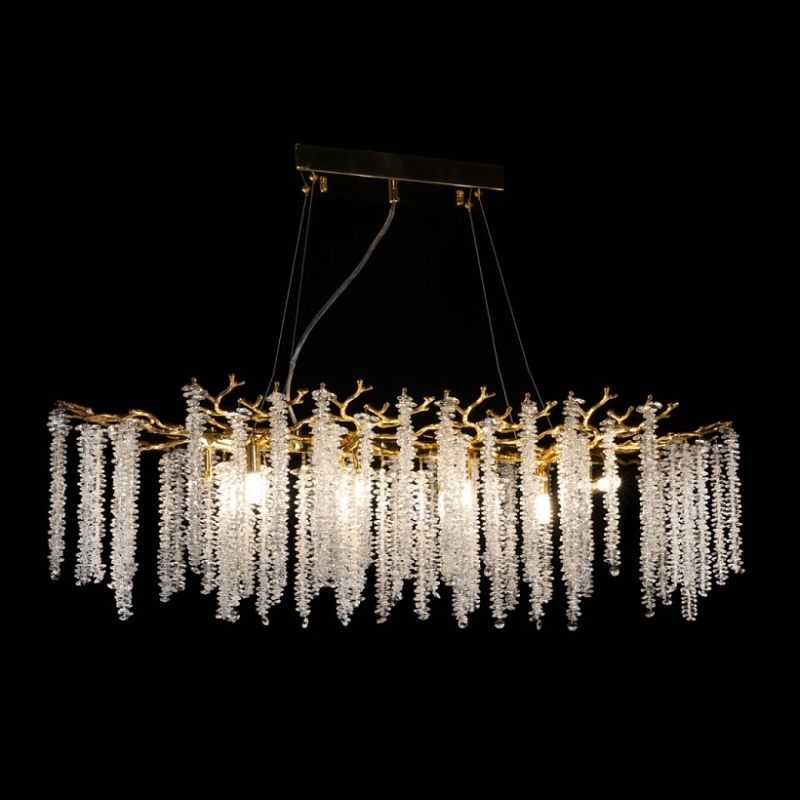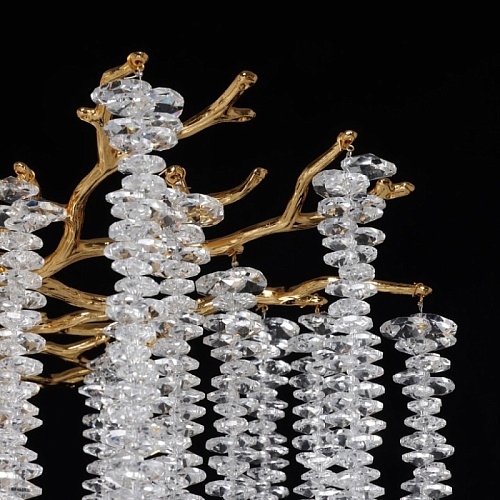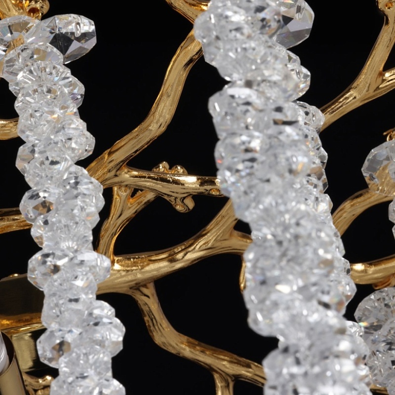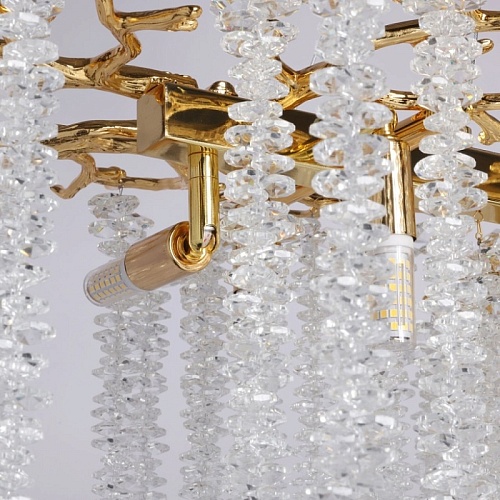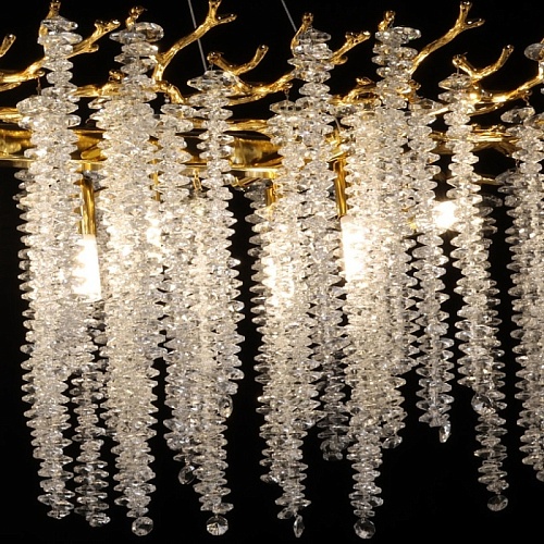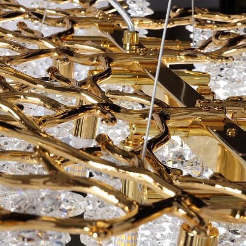 Основание подвесной люстры выполнено по технологии художественного литья из сплава алюминия с цинком и гальванизировано в цвет золота. Люстра декорирована гроздьями из прозрачного хрусталя.