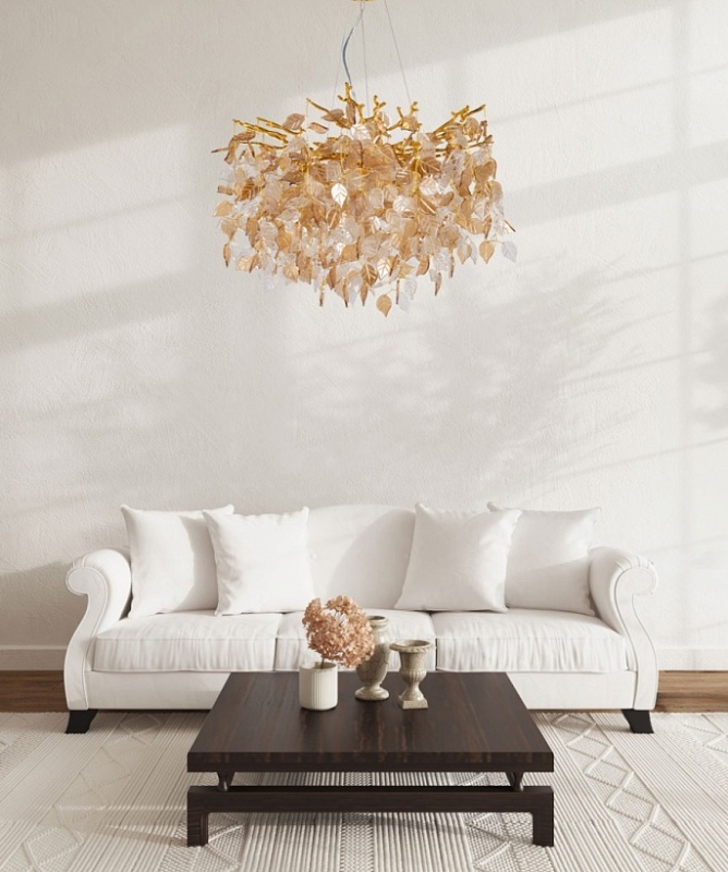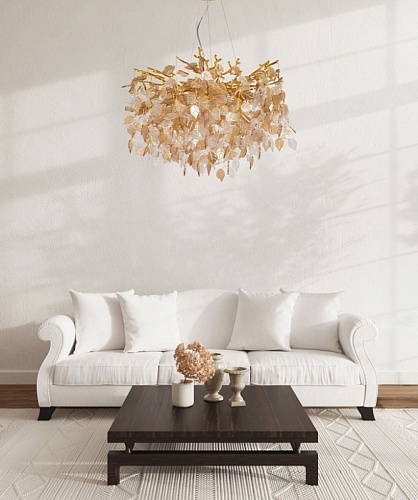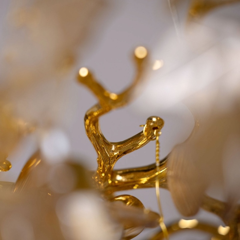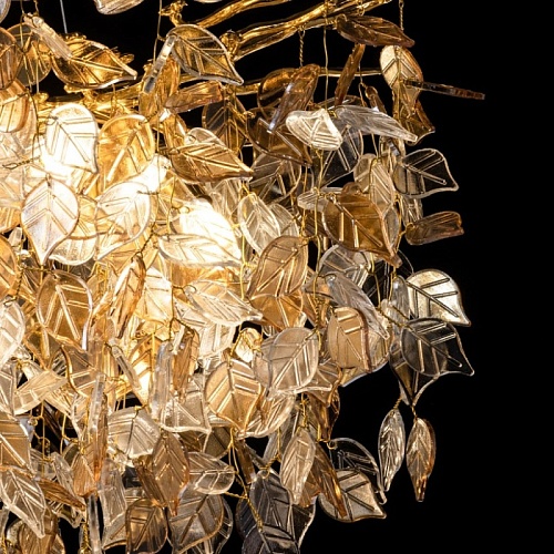 Основание подвесной люстры выполнено по технологии художественного литья из сплава алюминия с цинком и гальванизировано в цвет золота. Потолочная чаша закрыта фактурным художественным литьем. Люстра декорирована подвесками из прозрачного и гальванизированного в янтарный цвет стекла в форме листьев.