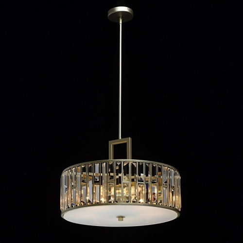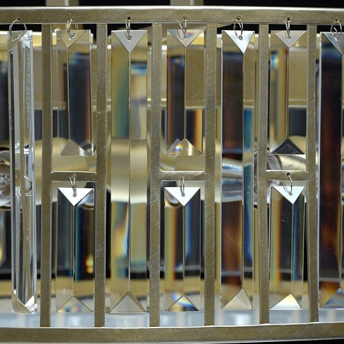 Основание выполнено из металла и обработано по технологии двойного окрашивания, основной слой - серебро, декоративный слой - перламутровое золото.Нижняя часть плафона закрыта матированным стеклом.Декор: прозрачный хрусталь прямоугольной формы.