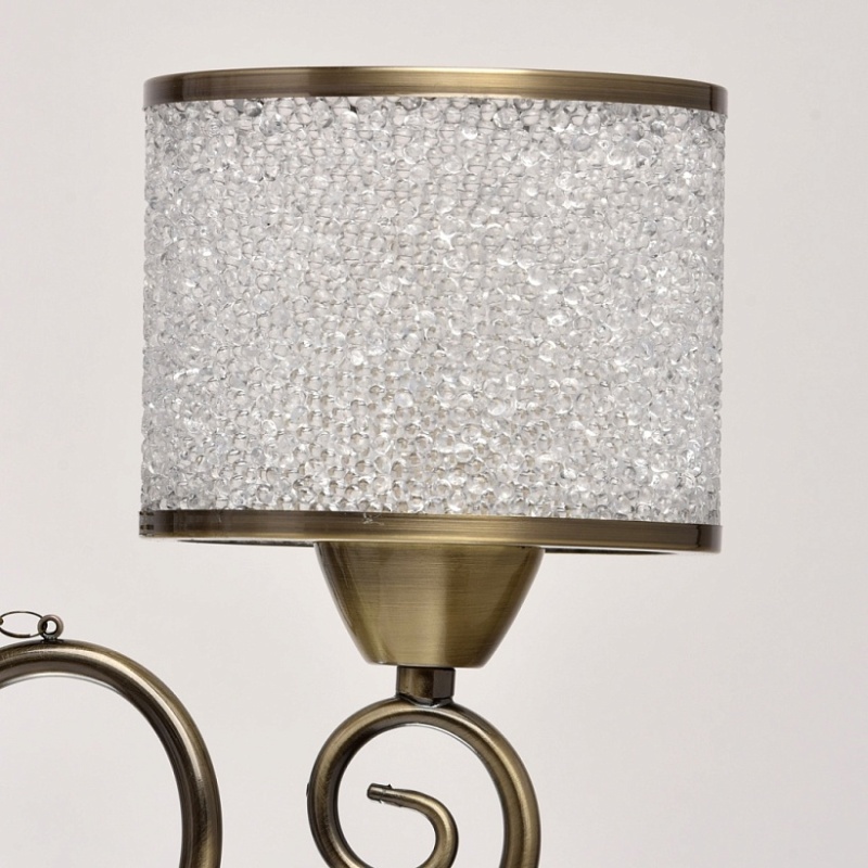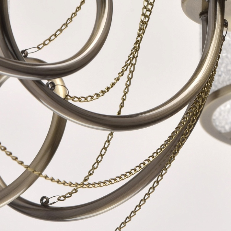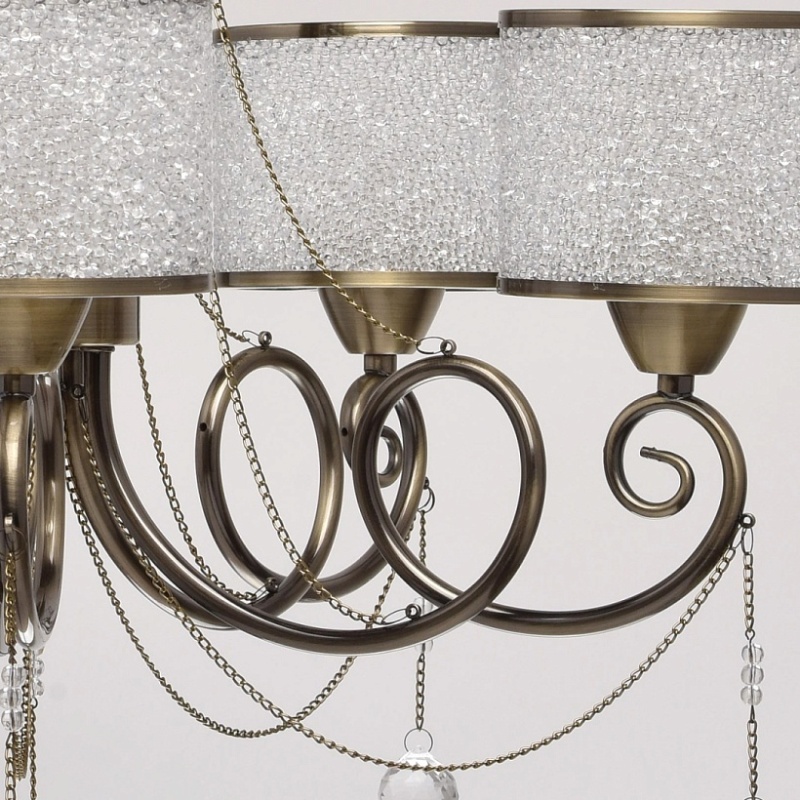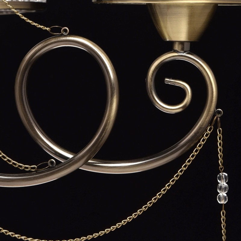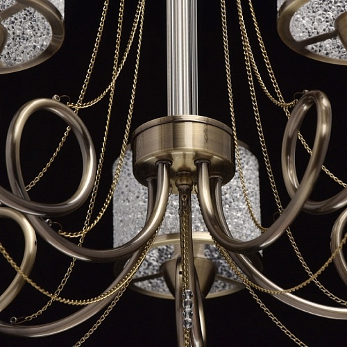 Основание светильника выполнено из металла и гальванизировано в цвет античной бронзы, лакировано. Потолочная чаша, корпус, декоративная розетка, держатели плафонов изготовлены по технологии токарной обработки. Рожки сложно изогнуты по технологии проката на роликовом станке. Плафоны отлиты из прозрачного акрила в виде спаянных пузырьков, с металлическим кантом в цвет основания. Декор: центральный стержень декорирован элементом из прозрачного рельефного стекла. Декоративные цепочки из металла гальванизированы в цвет арматуры и декорированы прозрачным хрусталем в форме шара.