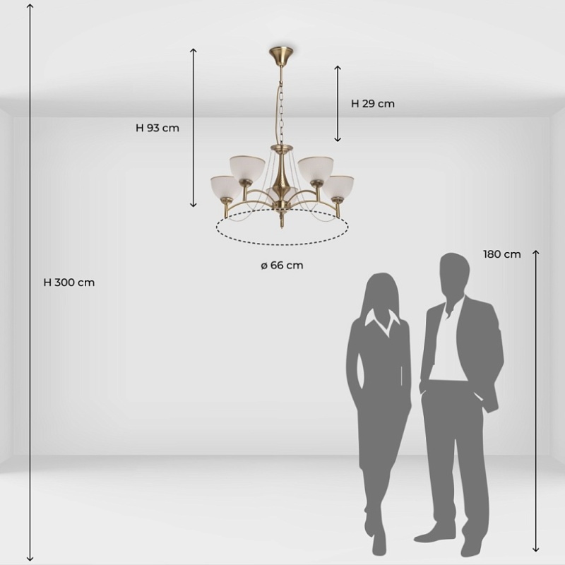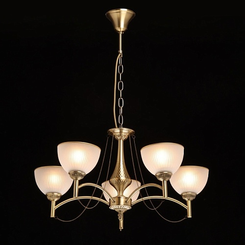 Металлическое основание подвесной люстры гальванизировано в цвет античной бронзы. Стеклянные плафоны вверх отлиты в сложную форму и матированы. Края плафонов окрашены вручную кантом золотого цвета. Люстра декорирована цепочками в цвет основания.