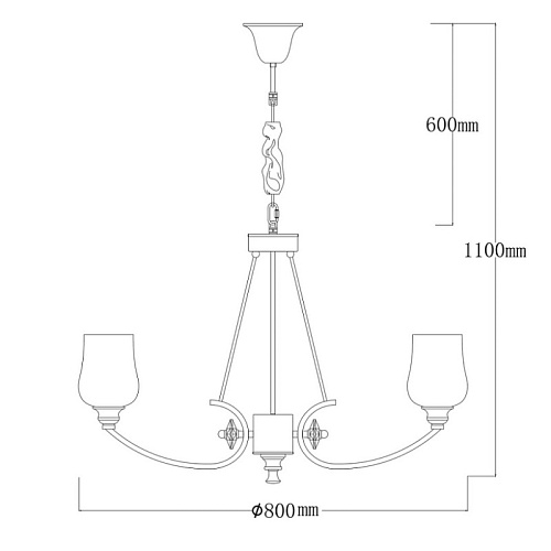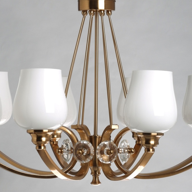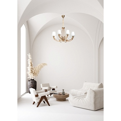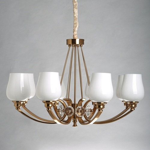 Основание выполнено из комбинации сплавов металлов и гальванизировано в цвет латуни. Рожки выполнены из сплава алюминия по технологии художественного литья, декоративные подвесы выполнены из металла по технологии твист. Стеклянные плафоны выдуваются в форму вручную и окрашены в белый цвет изнутри. Корпус светильника декорирован стеклянными розетками, отлитыми в сложную форму.