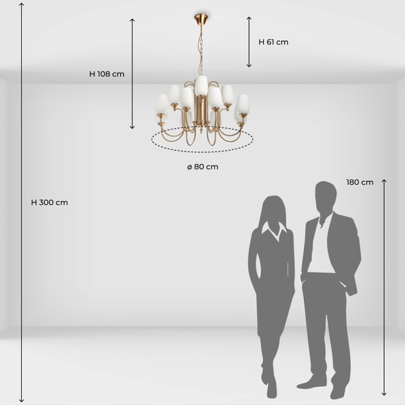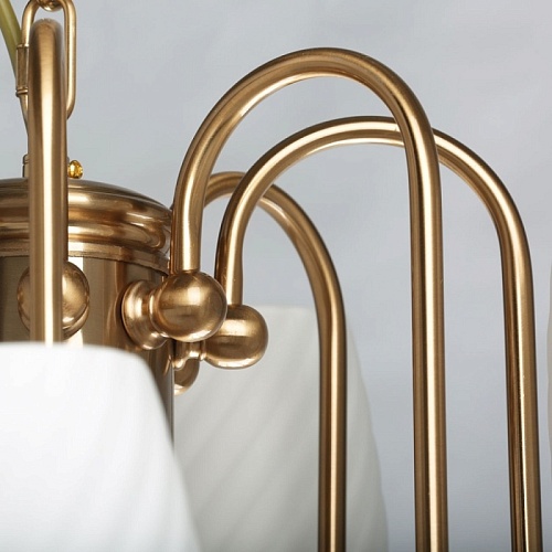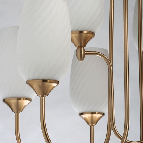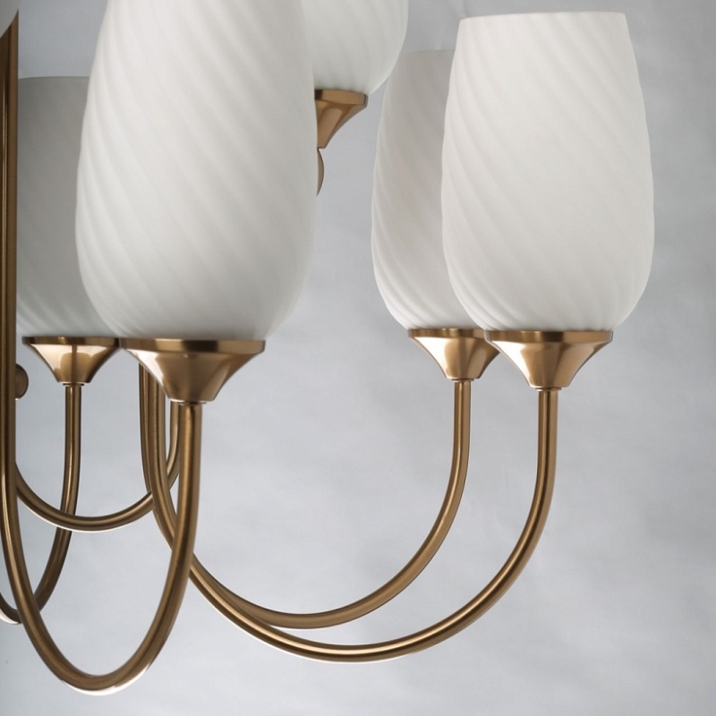 Металлическое основание светильника гальванизировано в цвет бронзы. Стеклянные плафоны молочного цвета с добавлением глушителей прозрачности отлиты в сложную форму, создающую спиралевидный рисунок.