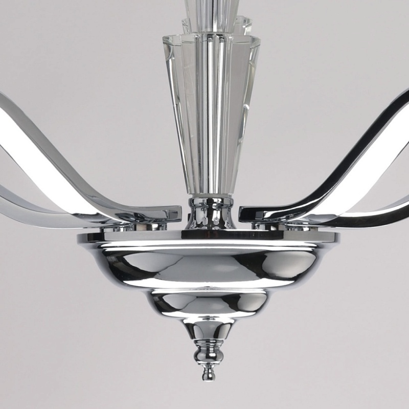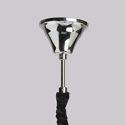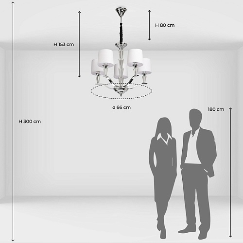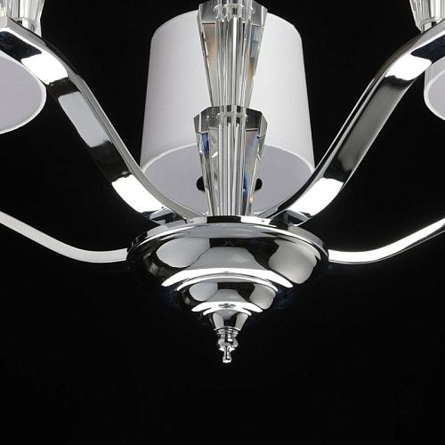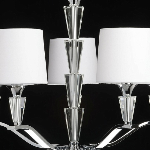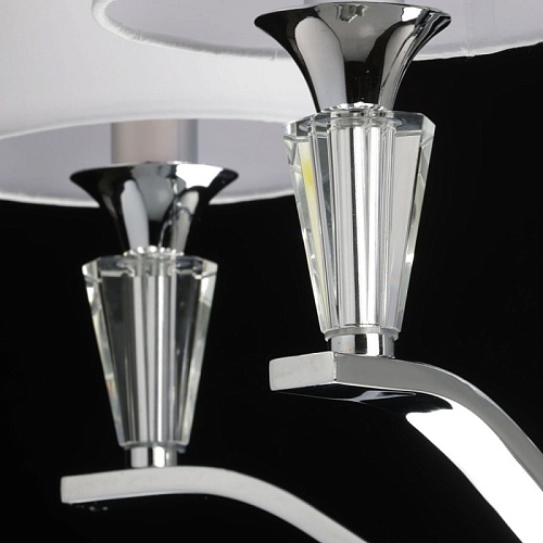 Металлическое основание светильника гальванизировано в цвет хрома. Двухслойные абажуры выполнены из текстиля белого цвета и термостойкого акрила. Подвесная люстра декорирована массивами из прозрачного хрусталя.