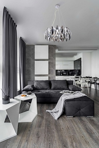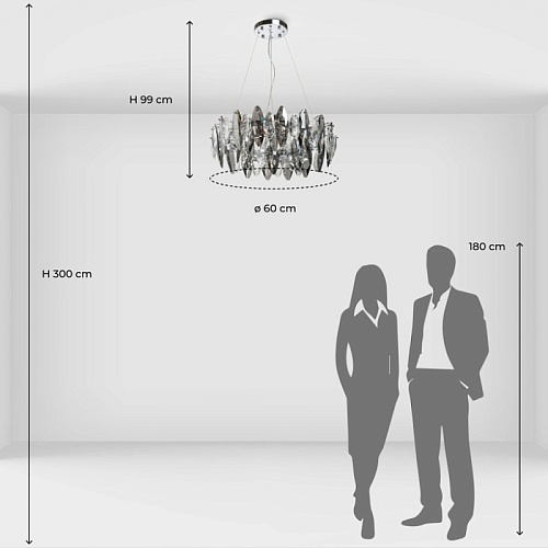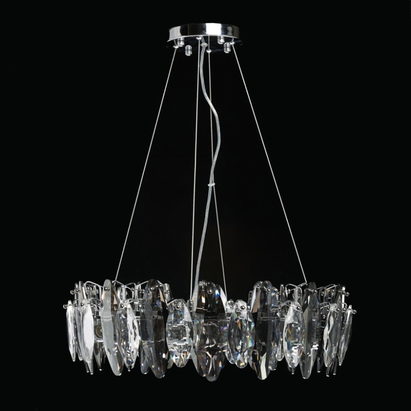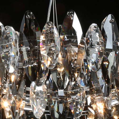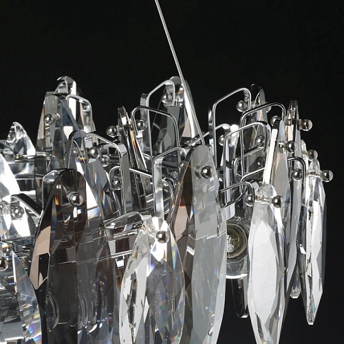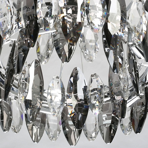 Металлическое основание светильника гальванизировано в цвет хрома. Светильник декорирован хрусталем оригинальной формы со сложной огранкой прозрачного и дымчатого цвета.
