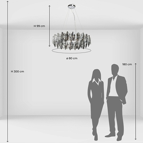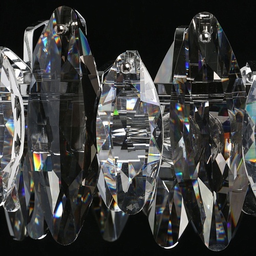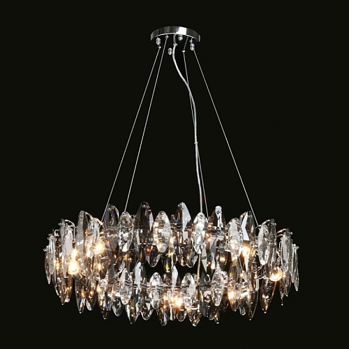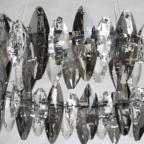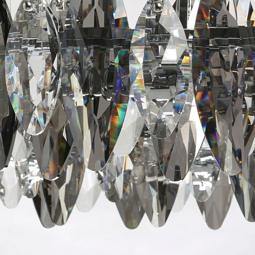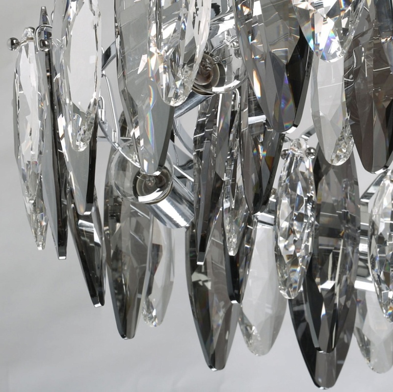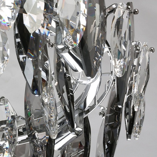 Металлическое основание светильника гальванизировано в цвет хрома. Светильник декорирован хрусталем оригинальной формы со сложной огранкой прозрачного и дымчатого цвета.
