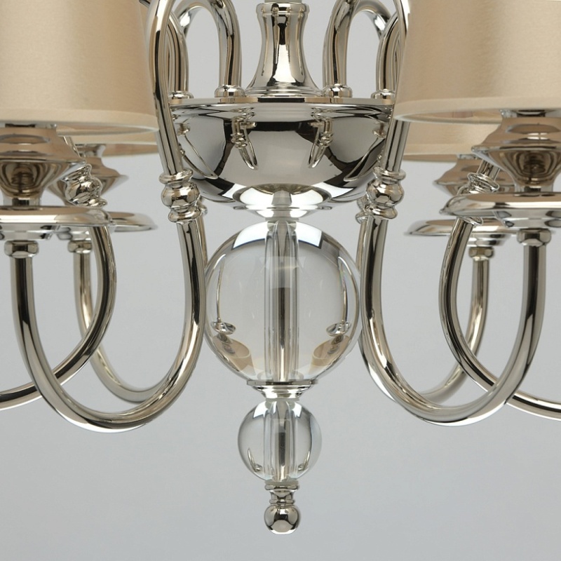 Металлическое основание гальванизировано в цвет хрома. Потолочная чаша, декоративные розетки, корпус, центральные стержень и декор на рожках изготовлены по технологии токарной обработки. Рожки изготовлены по технологии проката на роликовом станке. Декоративные элементы на центральном стержне выполнены из массива хрусталя. Абажуры выполнены из атласного текстиля бежевого цвета с термостойким акрилом внутри. Абажуры прошиты.