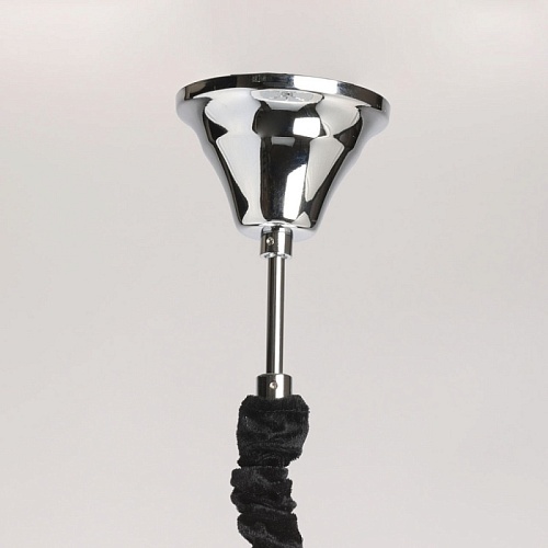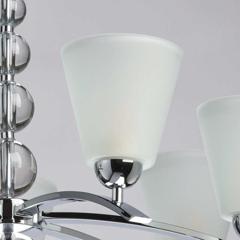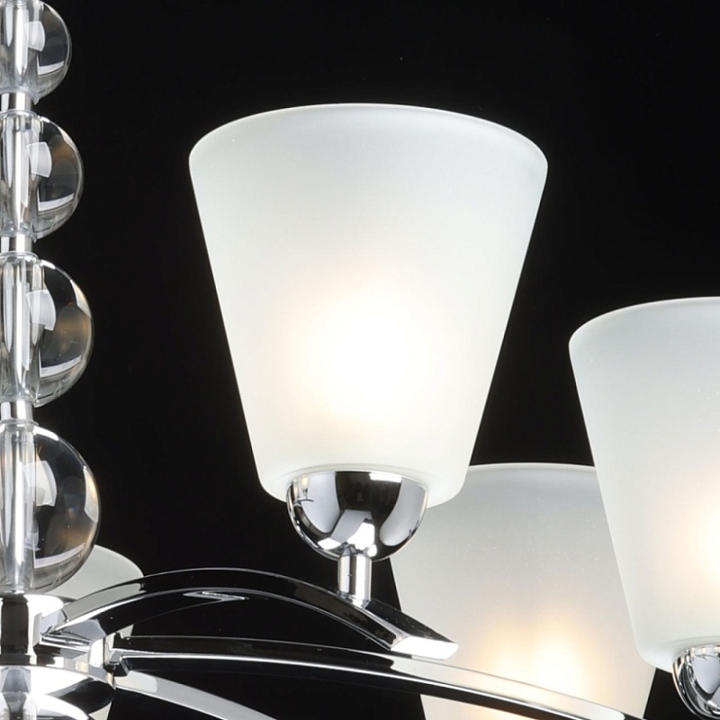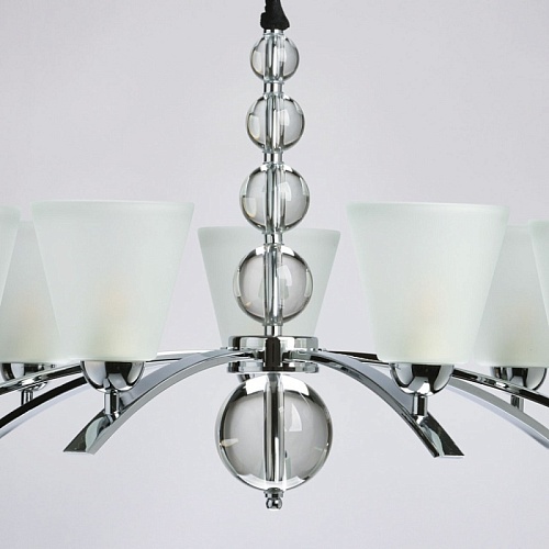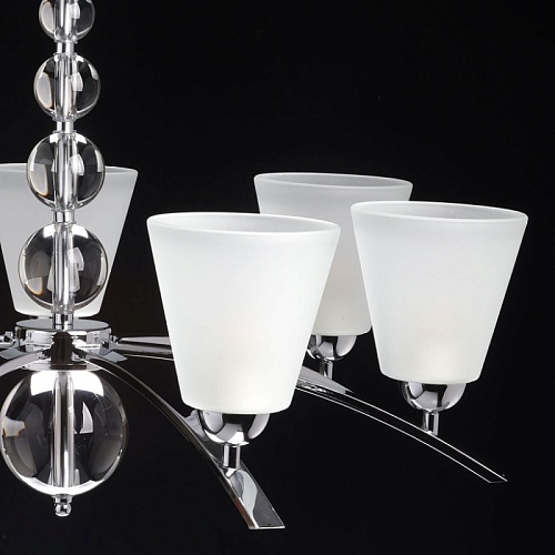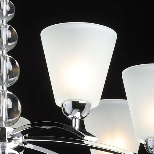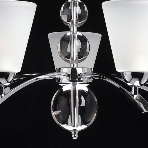 Металлическое основание подвесной люстры гальванизировано в цвет хрома. Центральная ось светильника декорирована прозрачными сферами из массива хрусталя. Источники света закрыты стеклянными плафонами, отлитыми в форму и окрашенными в белый цвет с внутренней стороны.