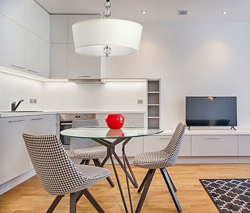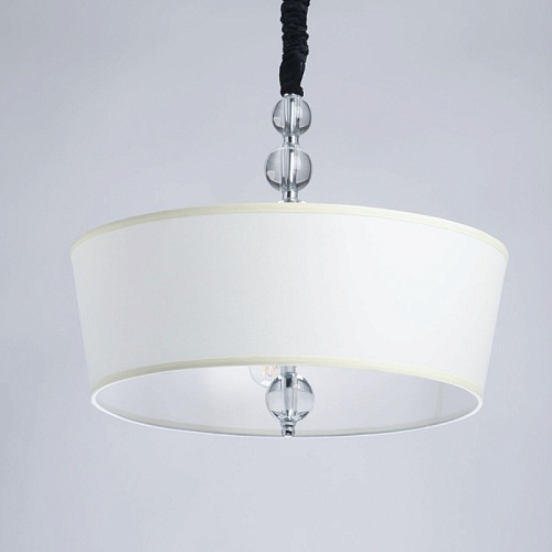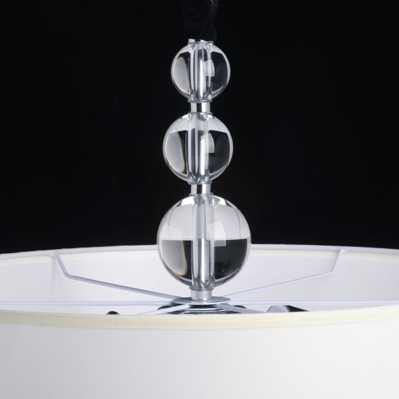 Металлическое основание светильника гальванизировано в цвет хрома. Источники света закрыты белым текстильным абажуром с термостойким акрилом внутри. Центральная ось светильника декорирована сферами из прозрачного массива хрусталя.