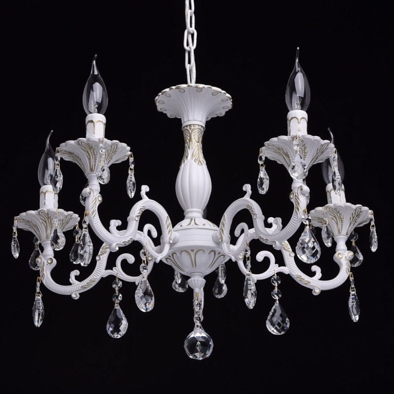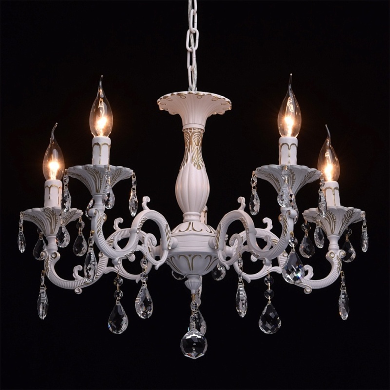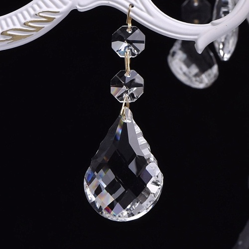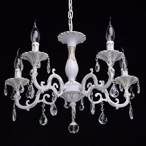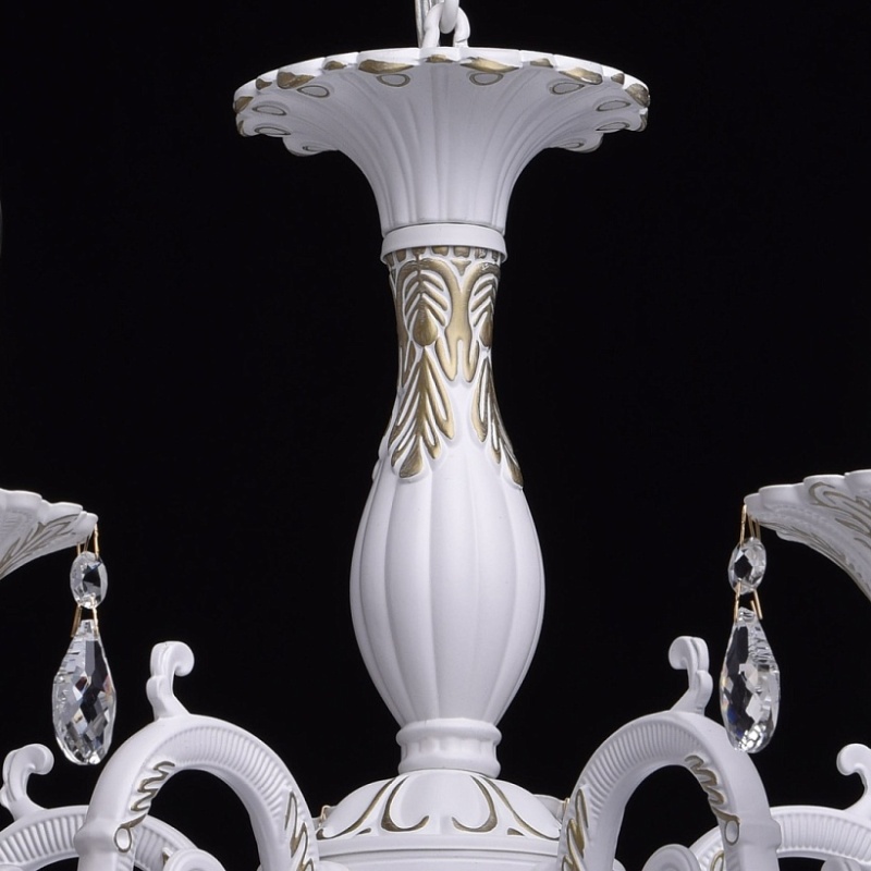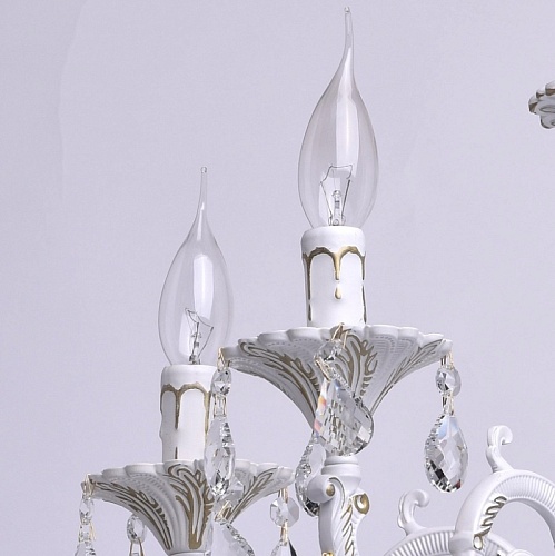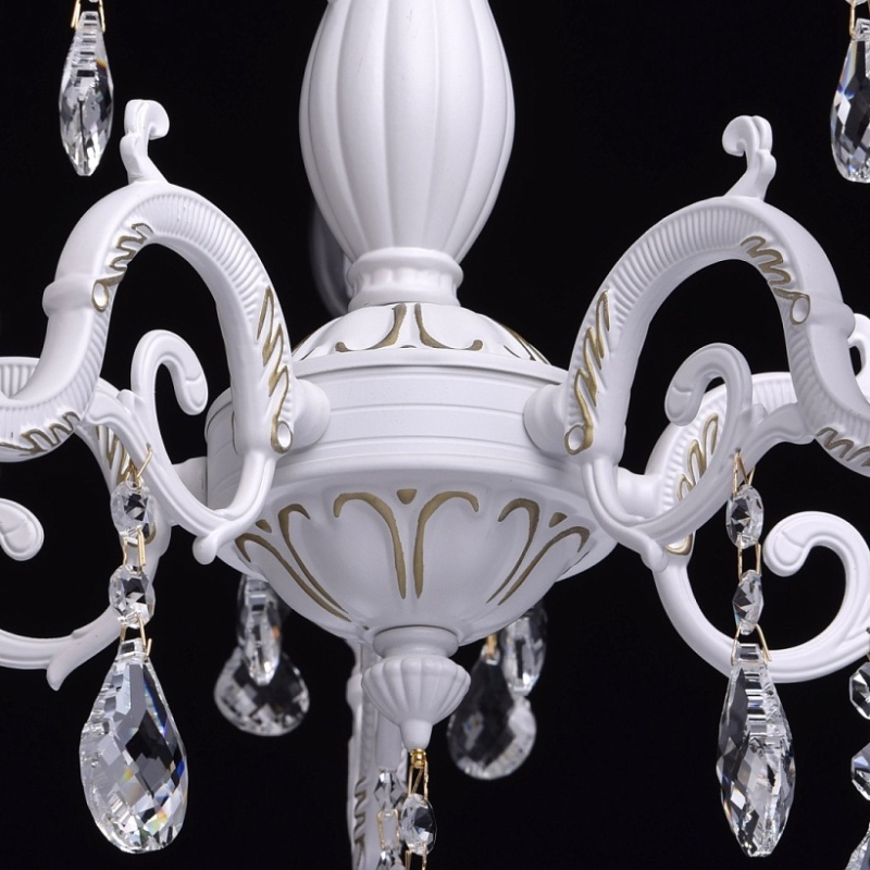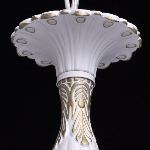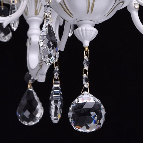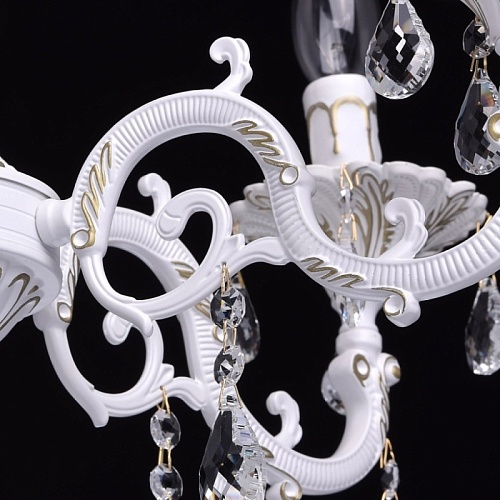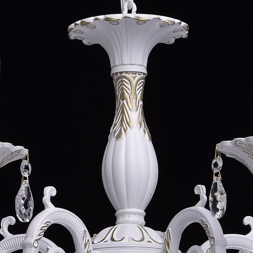 Основание светильника выполнено из комбинации сплавов металлов и обработано по технологии ручного окрашивания: основной защитный слой белого матового цвета, затем в ручную окрашены выступающие части орнамента. Основание светильника выполнено из сплава металла по технологии прессования. Рожки, центральная ось и декоративные розетки выполнены из сплава алюминия с цинком по технологии художественного литья в кокиль под давлением. Светильник декорирован подвесками из хрусталя категории "a-grade" сложной огранки
