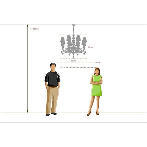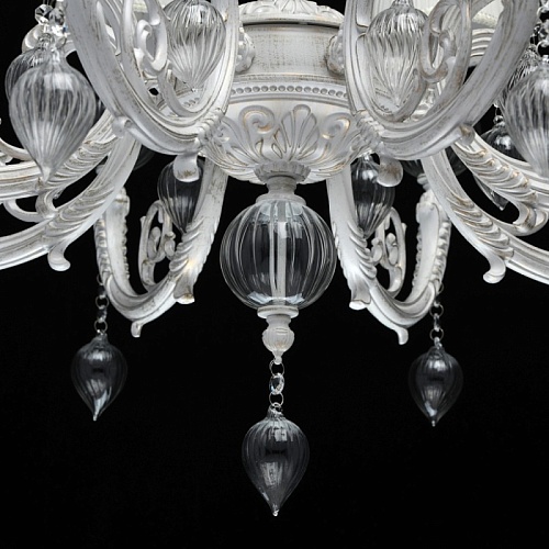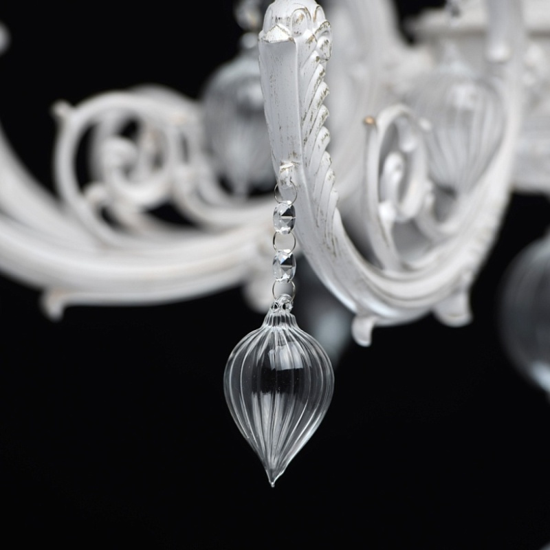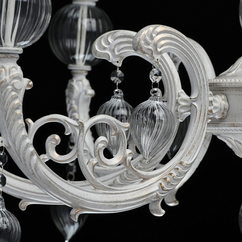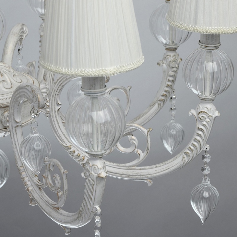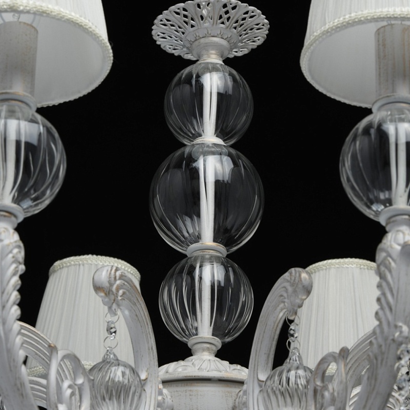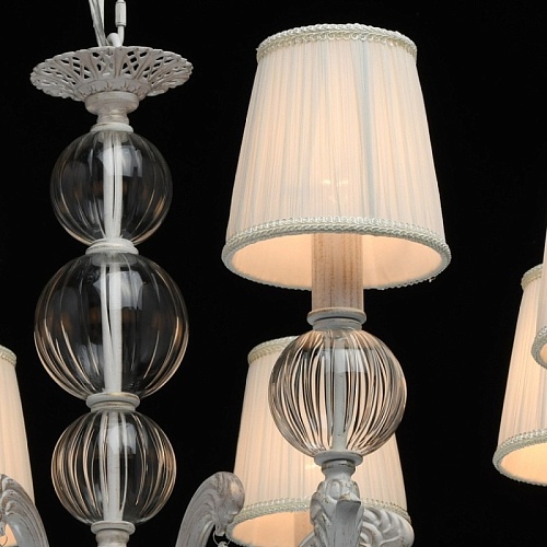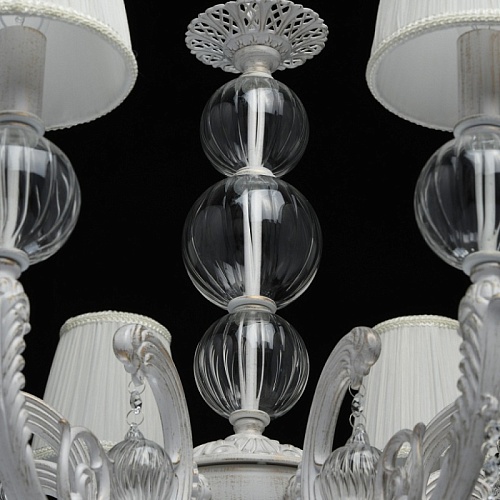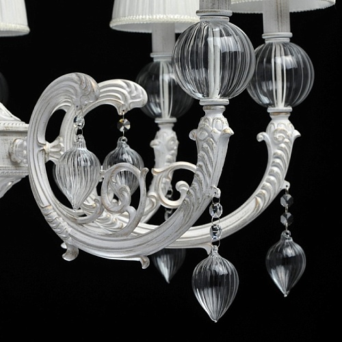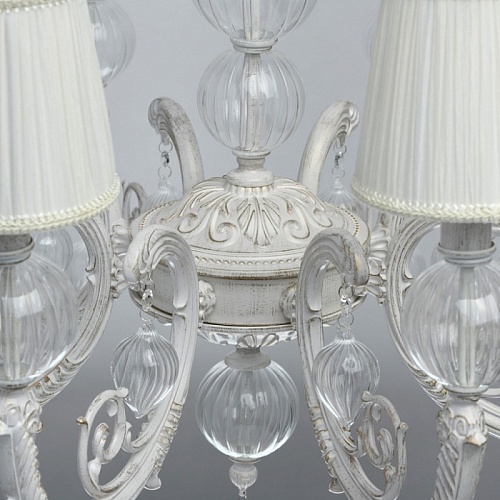 Основание светильника выполнено из комбинации сплавов металлов и обработано по технологии хай-лайт, основной слой белого цвета, декоративный слой цвета золота. Рожки, верхняя и нижняя часть корпуса выполнены из сплава алюминия по технологии художественного литья. Декоративная розетка выполнена из металла по технологии прессования. Абажуры из двойного текстиля белого цвета с добавлением тонкой нити люрекса золотого цвета. Кант в верхней и нижней части абажура. Светильник декорирован выдувным стеклом и прозрачным хрусталем формы октагон.