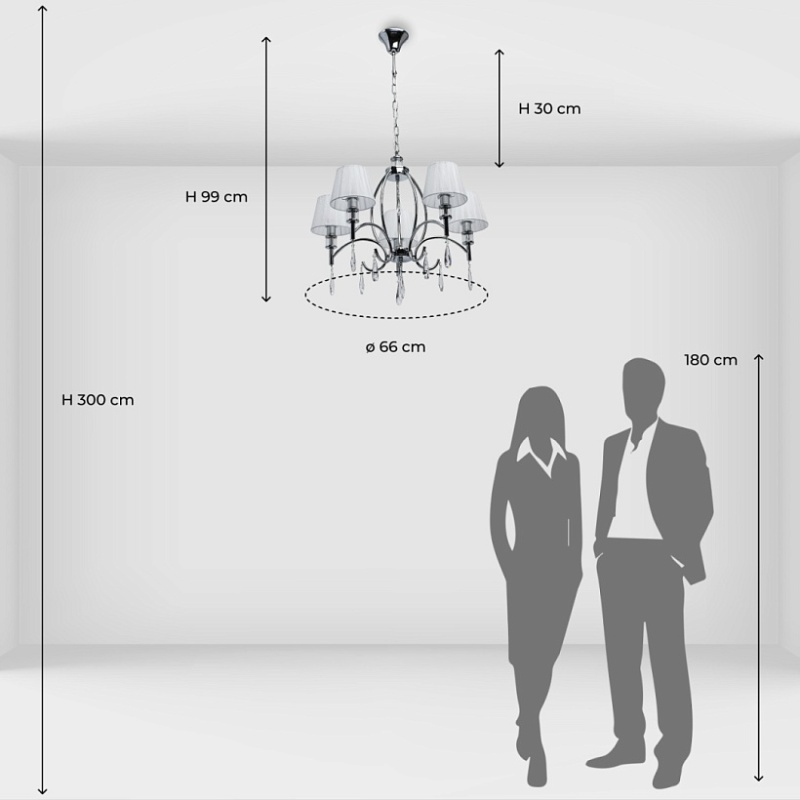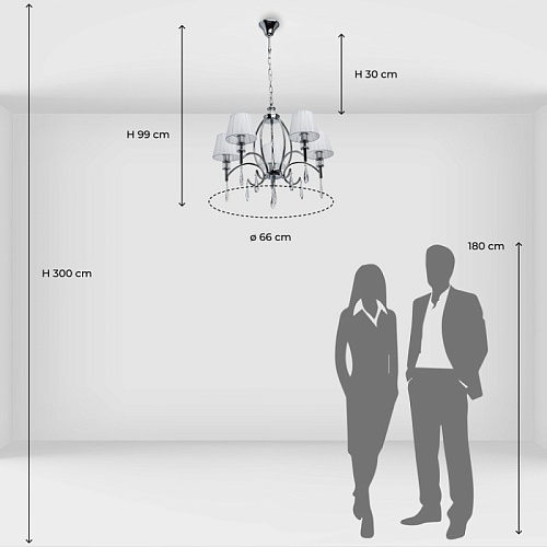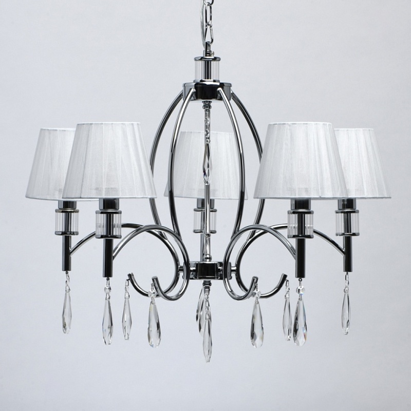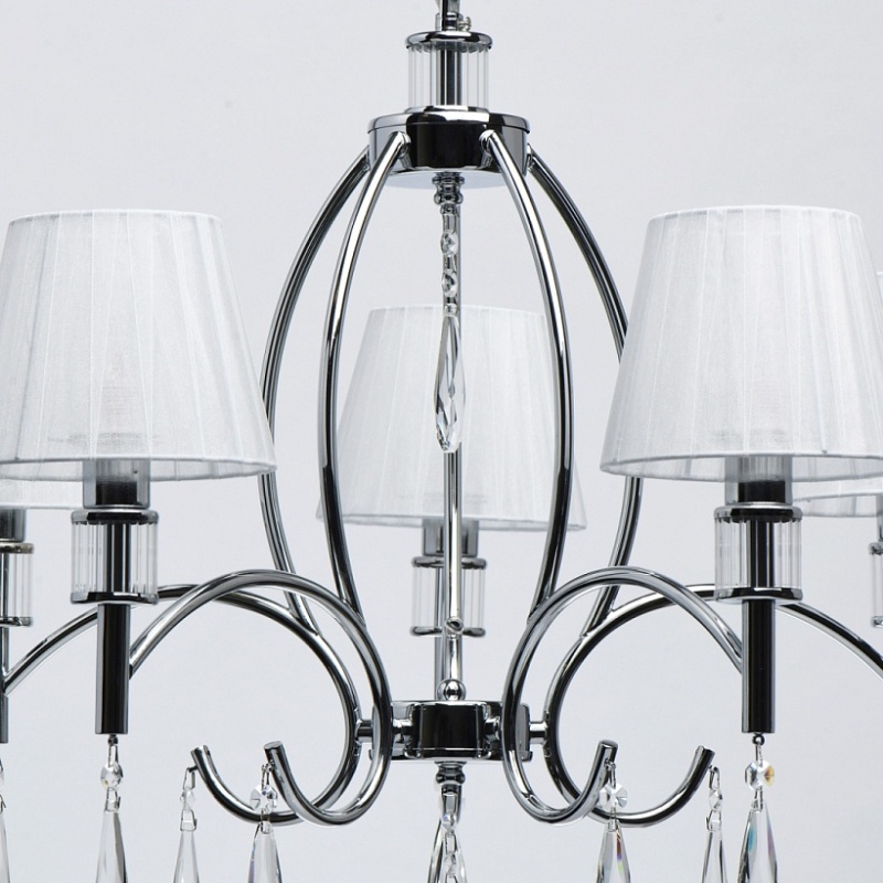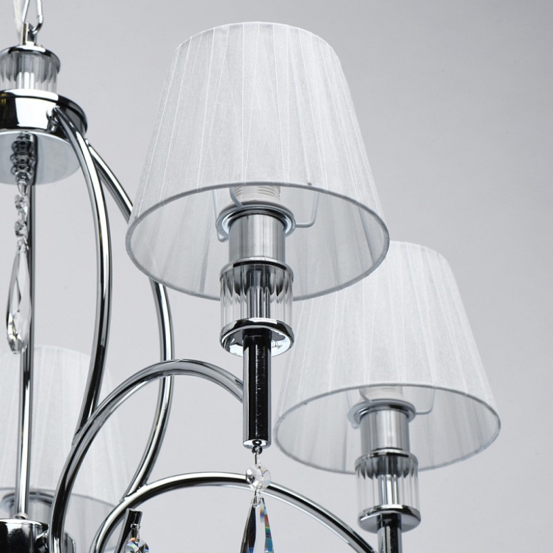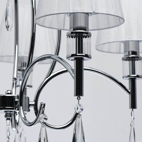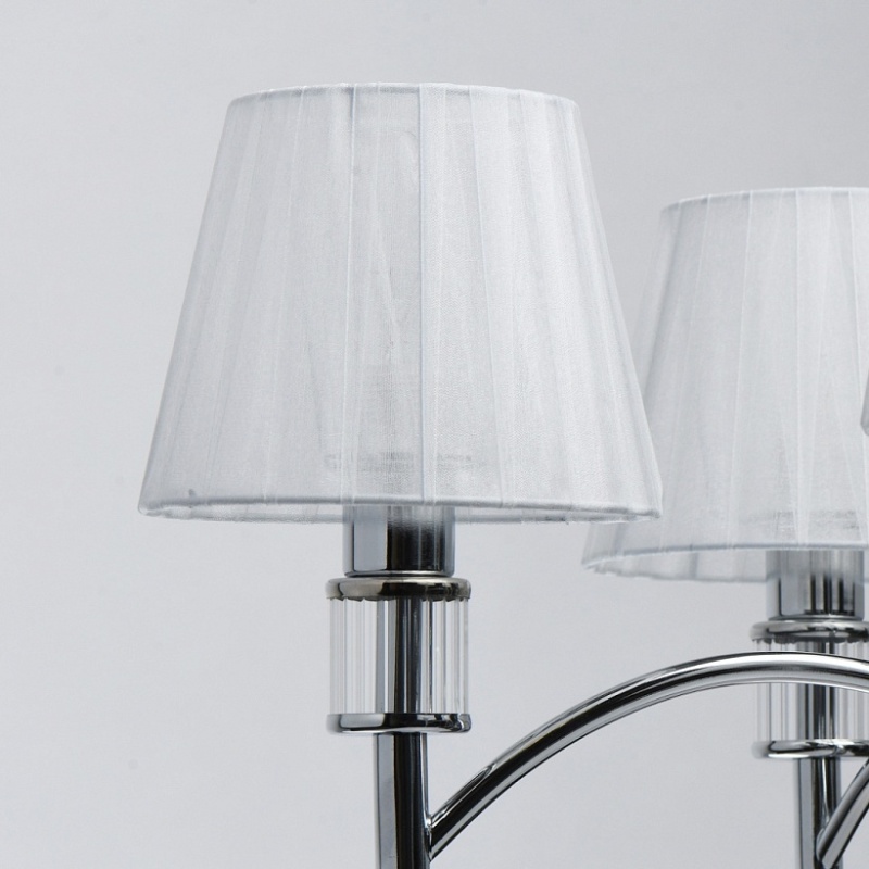 Металлическое основание светильника гальванизировано в цвет хрома. Светильник декорирован прозрачным хрусталем оригинальной вытянутой формы. Источники света закрыты текстильными абажурами из органзы белого цвета.