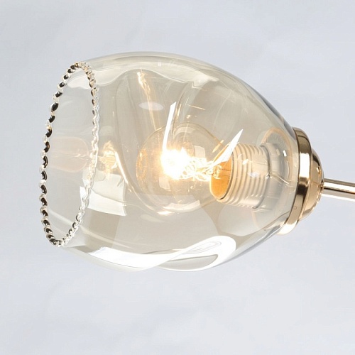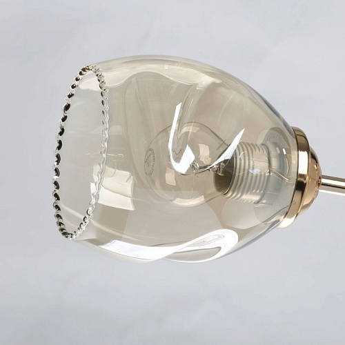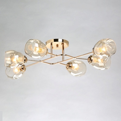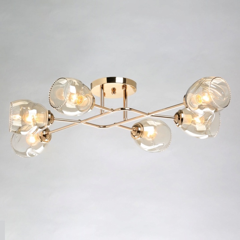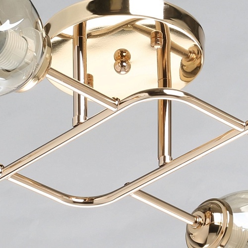 Металлическое основание потолочного светильника гальванизировано в цвет золота. Стеклянные плафоны отлиты в сложную форму и гальванизированы в цвет шампань.