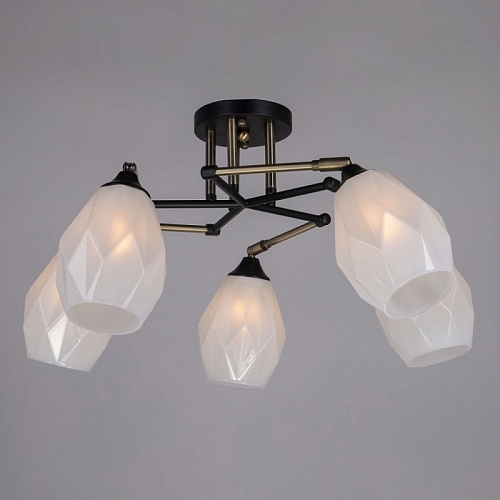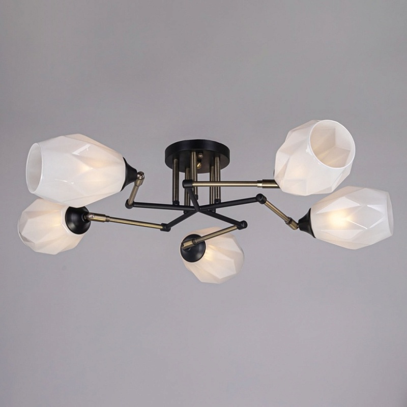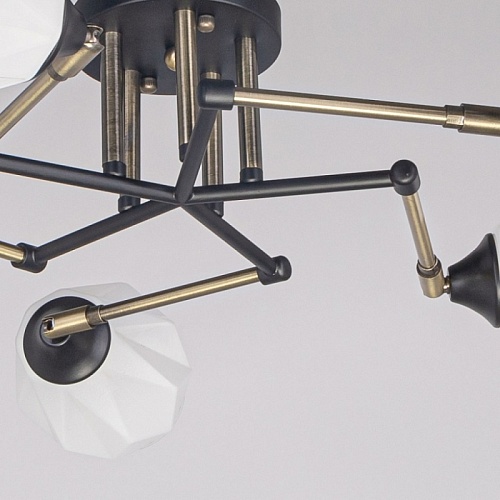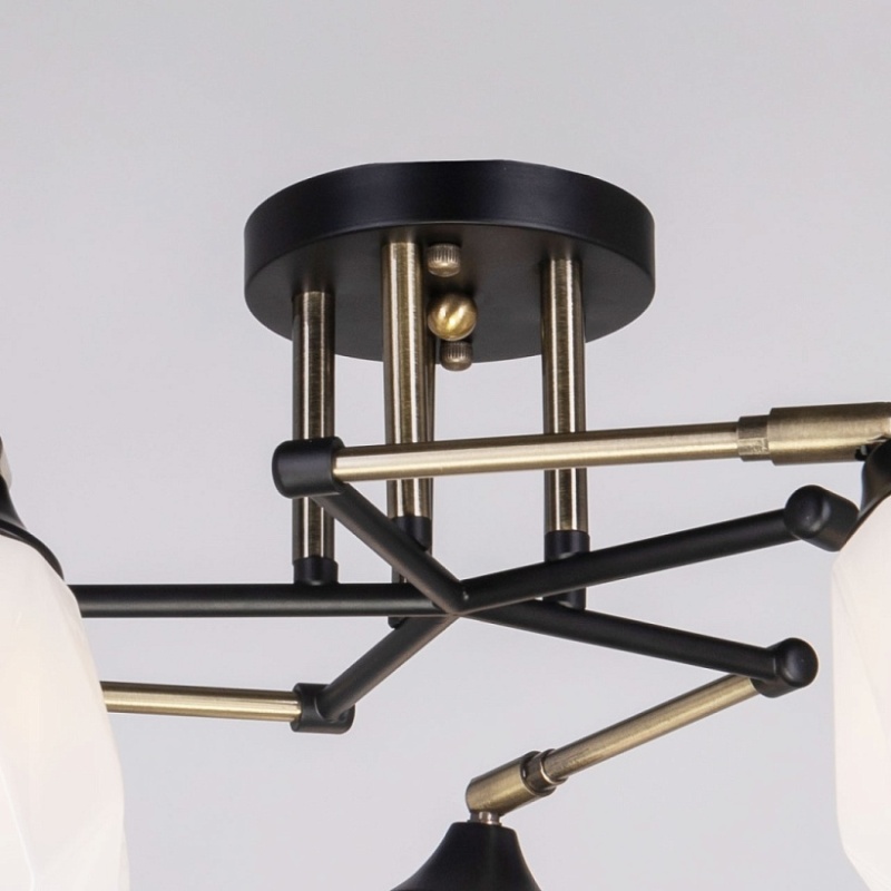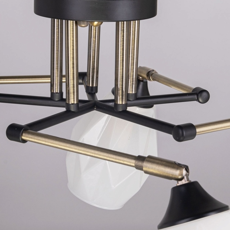 Металлическое основание потолочной люстры окрашено в черный цвет. Отдельные элементы основания гальванизированы в цвет античной бронзы. Потолочная люстра декорирована белыми стеклянными плафонами сложной формы.