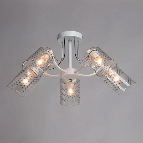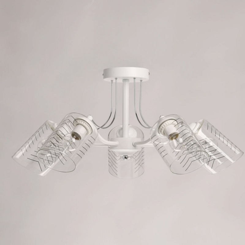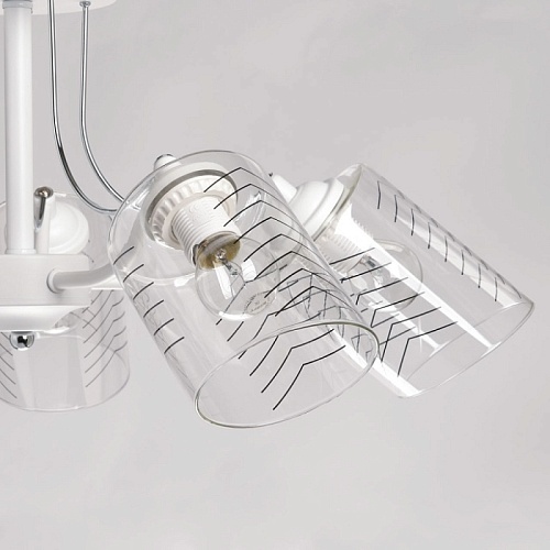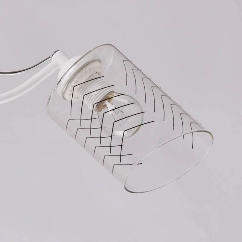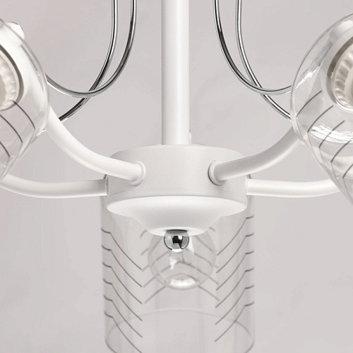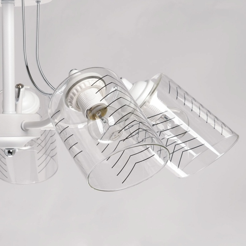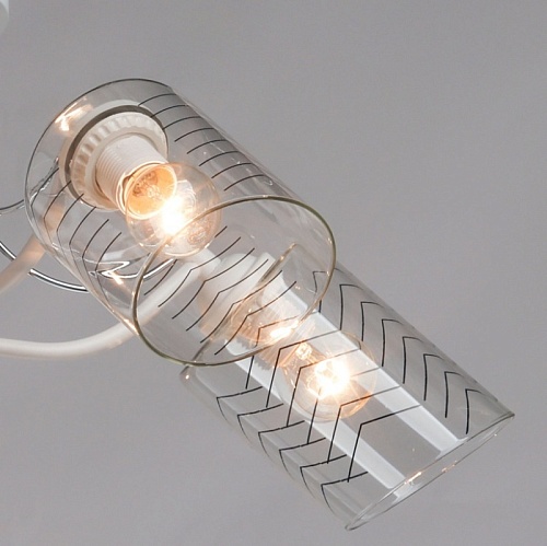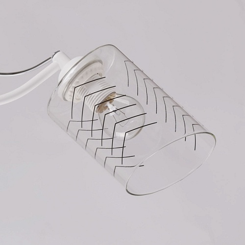 Металлическое основание потолочной люстры окрашено в белый цвет. Отдельные элементы основания гальванизированы в цвет хрома. На прозрачные стеклянные плафоны вытянутой формы нанесен геометричный орнамент.