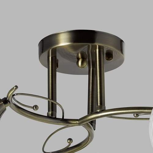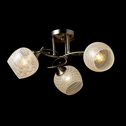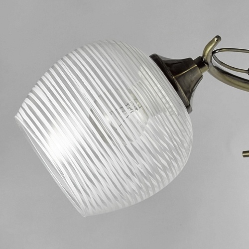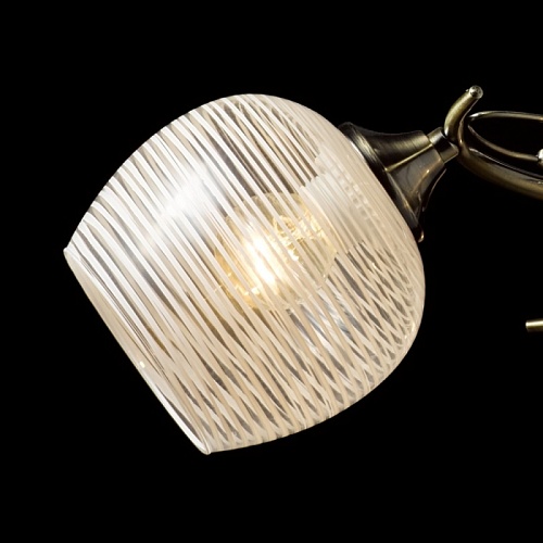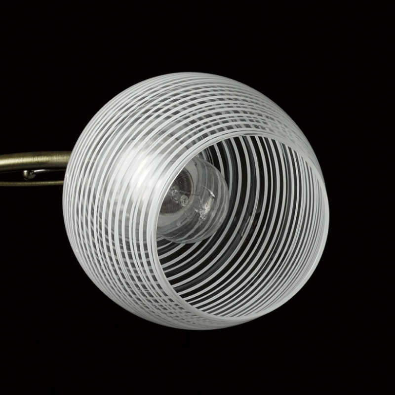 Основание светильника выполнено из металла и гальванизировано в цвет античной бронзы. Стеклянные плафоны окрашены белой краской в тонкую полоску. Края плафонов оплавлены.