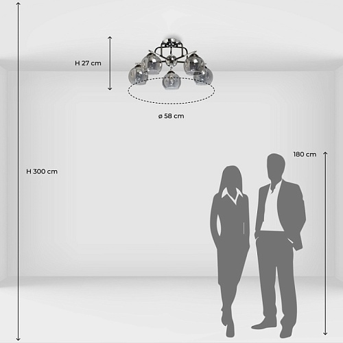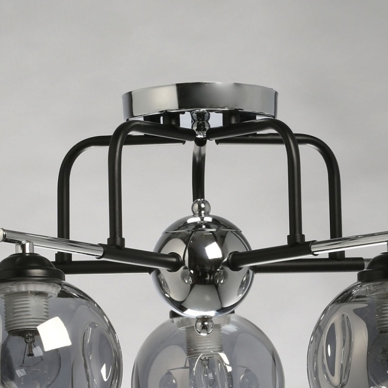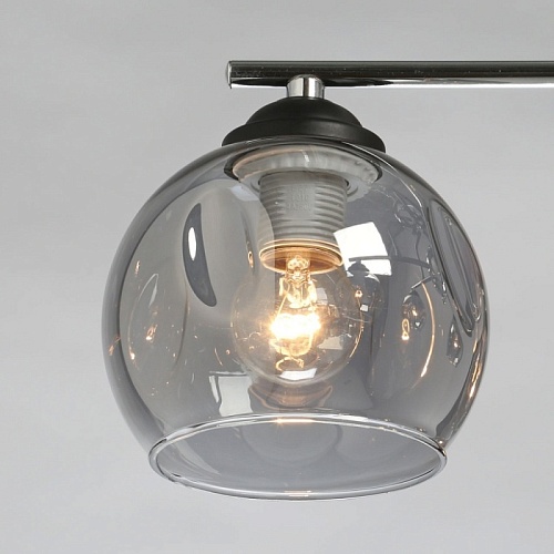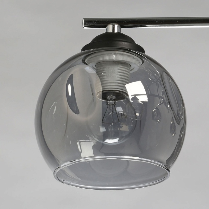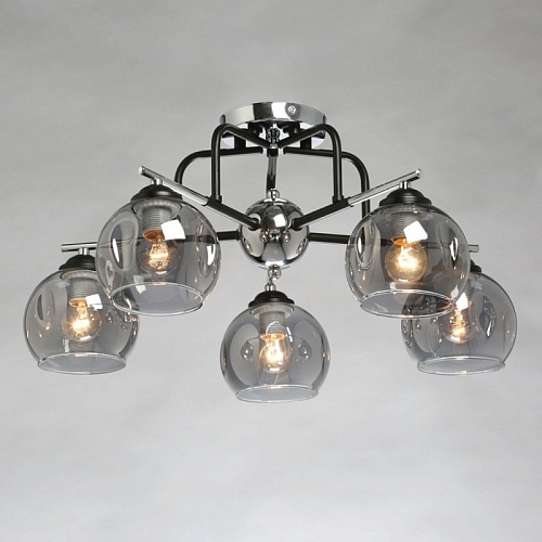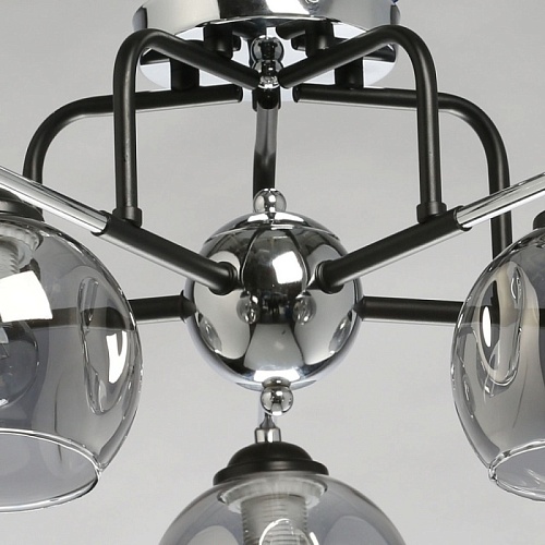 Основание светильника выполнено из металла и гальванизировано в цвет хрома. Рожки и держатели плафонов окрашены в черный цвет. Стеклянные плафоны выдуваются в форму и гальванизированы в дымчатый цвет. Края плафонов оплавлены.