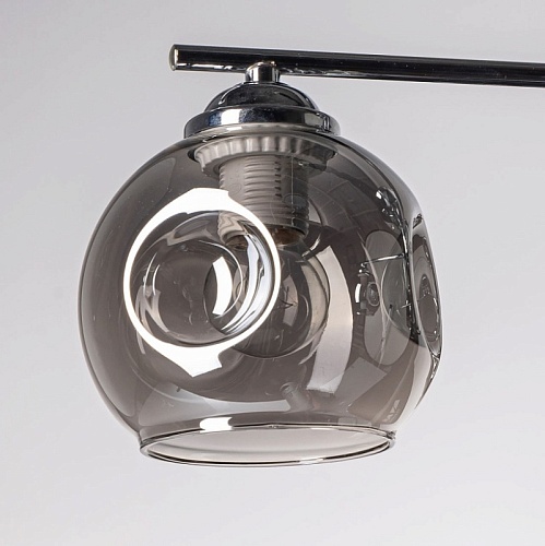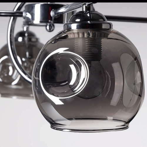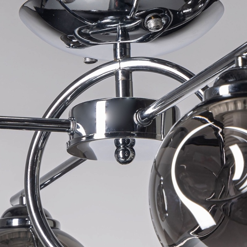 Металлическое основание светильника гальванизировано в цвет хрома. Потолочная люстра декорирована выдувными вручную стеклянными плафонами. Плафоны гальванизированы в дымчатый металлизированный цвет.