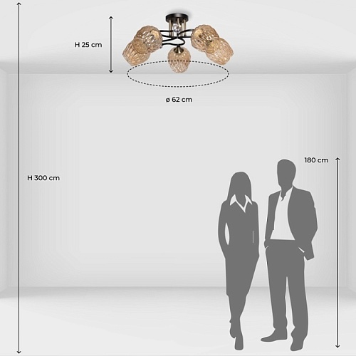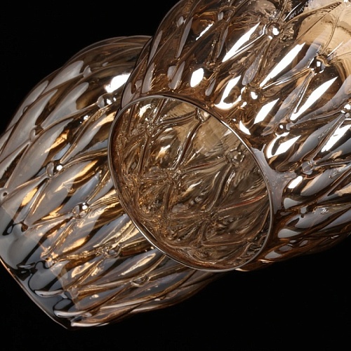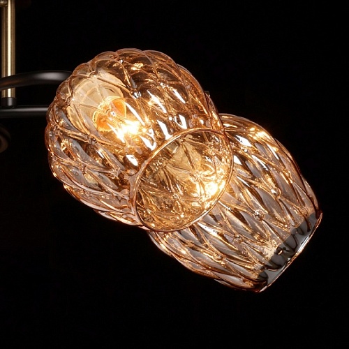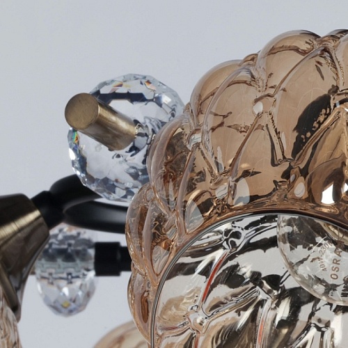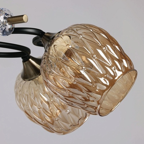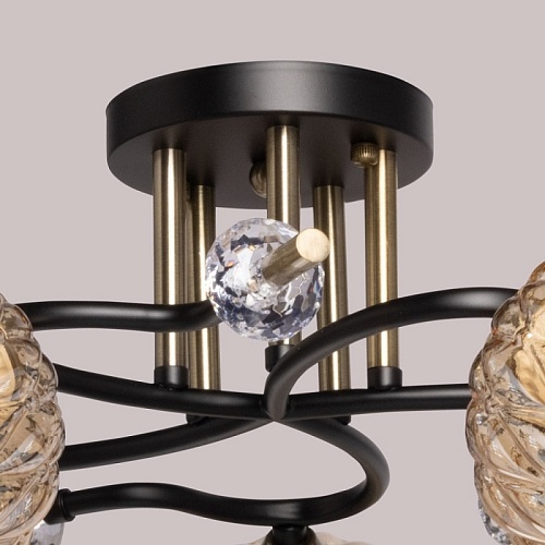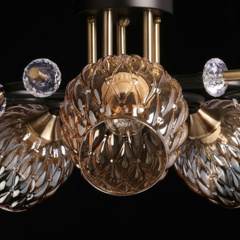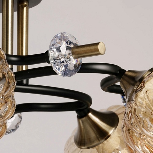 Металлическое основание потолочной люстры окрашено в черный цвет. Отдельные элементы основания гальванизированы в цвет бронзы. Стеклянные плафоны отлиты в сложную форму и гальванизированы в цвет коньяк. Люстра декорирована прозрачными стеклянными элементами.
