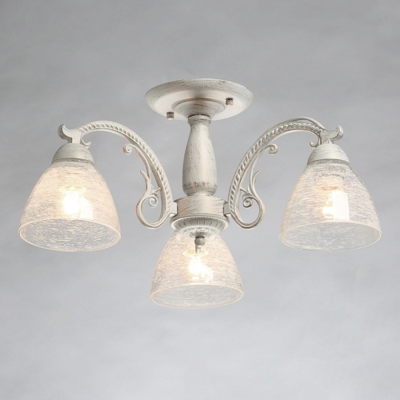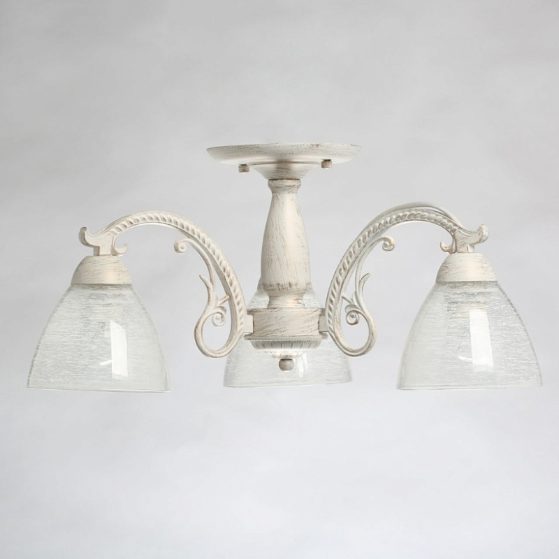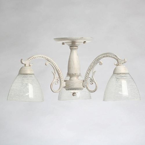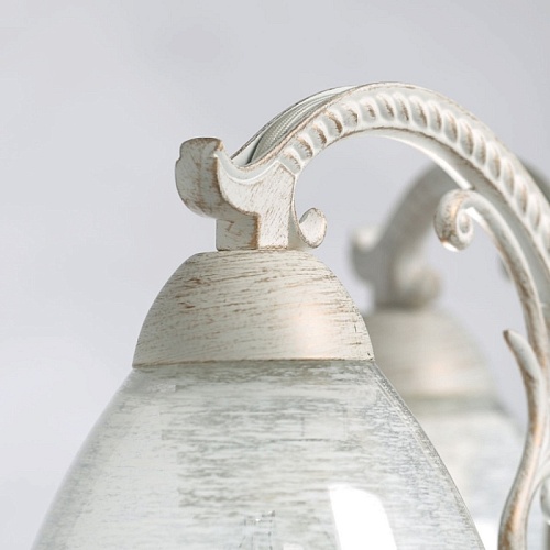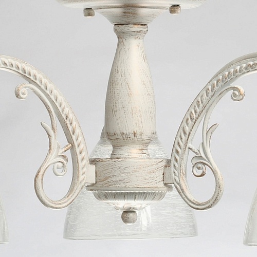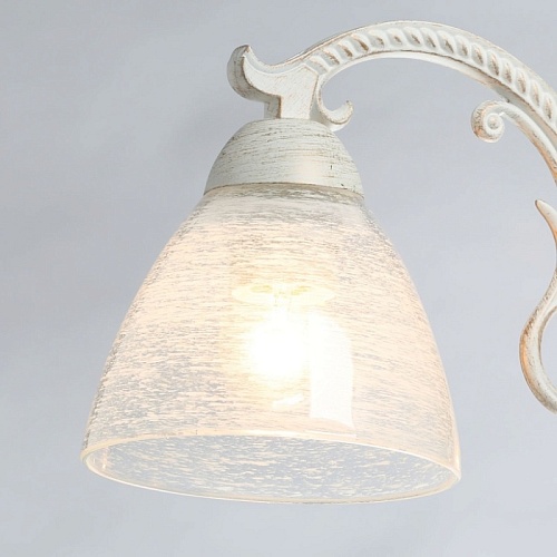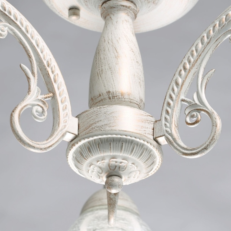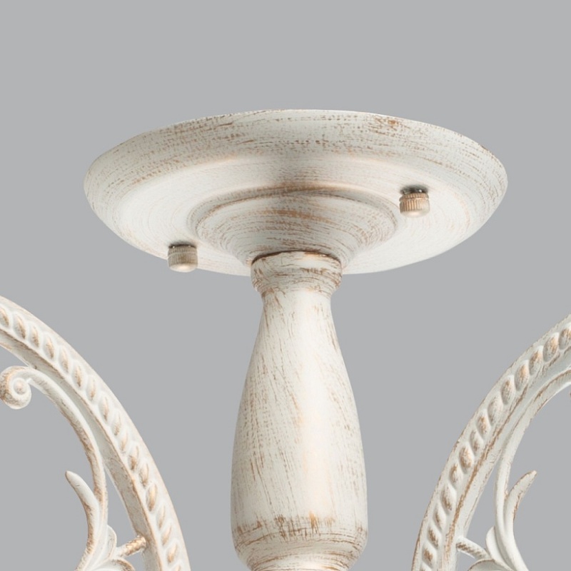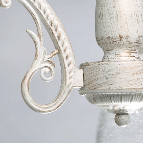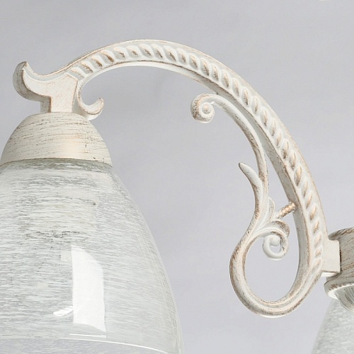 Основание светильника выполнено из комбинации сплавов металлов и обработано по технологии хай-лайт, где основной слой белого цвета, а декоративный слой - золотого. Рожки выполнены из сплава алюминия по технологии художественного литья. На стеклянные плафоны нанесен рисунок белой краской в виде паутинки.