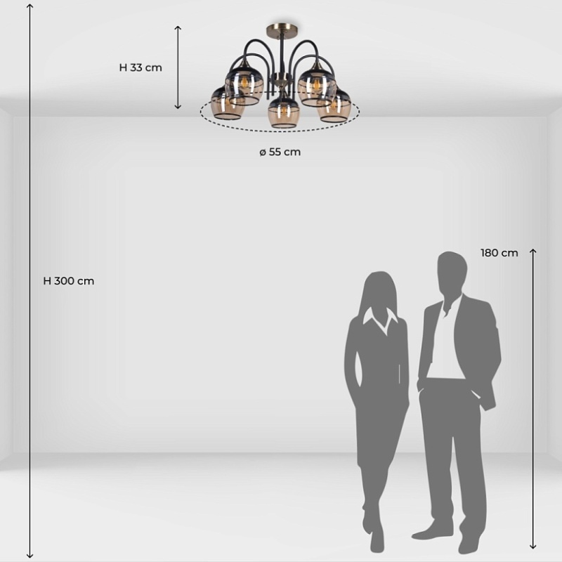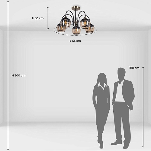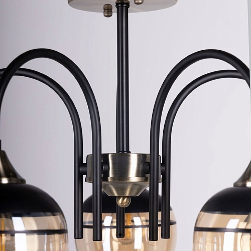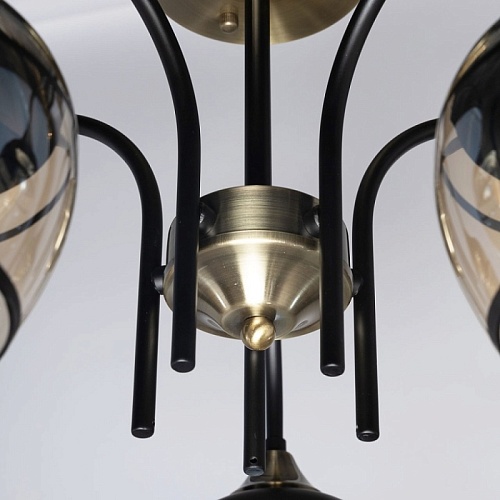 Металлическое основание светильника окрашено в черный цвет. Отдельные элементы основания потолочной люстры гальванизированы в цвет античной бронзы. Потолочная люстра декорирована выдувными вручную стеклянными плафонами, гальванизированными в цвет шампань. У основания плафоны окрашены в черный цвет.