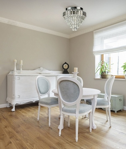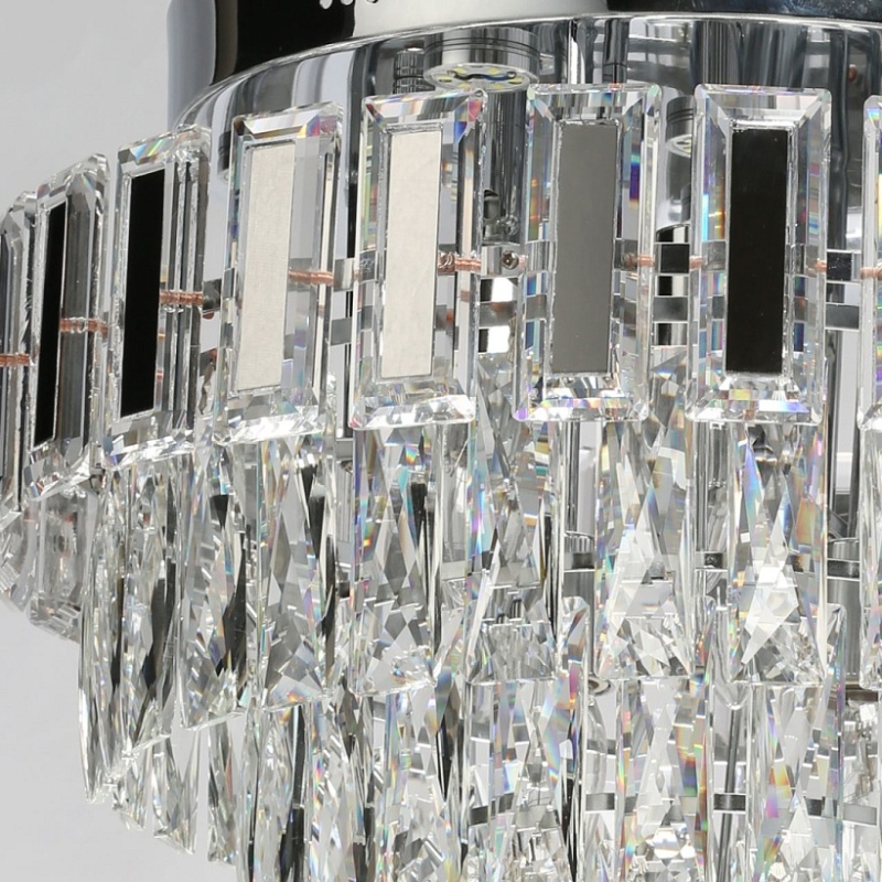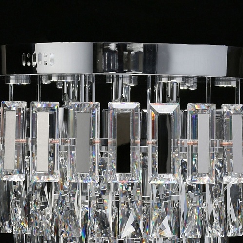 Металлическое основание светильника гальванизировано в цвет хрома. Светильник декорирован хрусталем прямоугольной формы. Верхний ярус хрусталя декорирован пластинами из нержавеющей стали, отполированной до зеркального блеска.