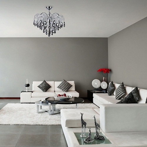 Металлическое основание гальванизировано в цвет хрома. Светильник декорирован хрусталем формы ромбов, гальванизированным в дымчатый цвет и прозрачным хрусталем в форме октагонов.