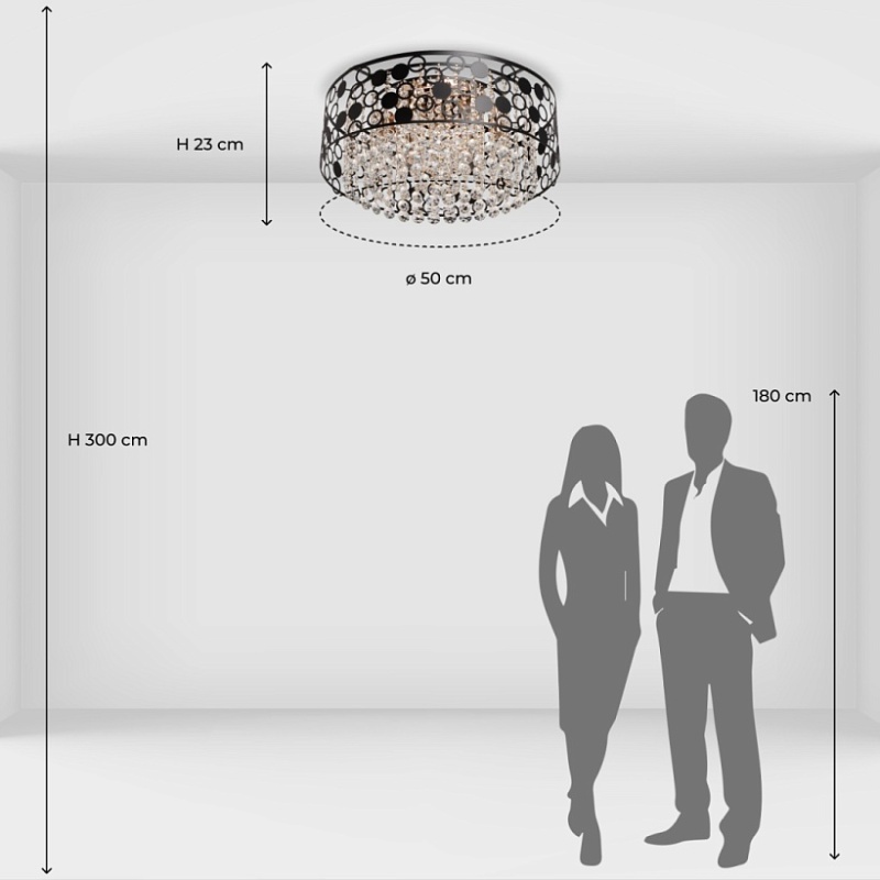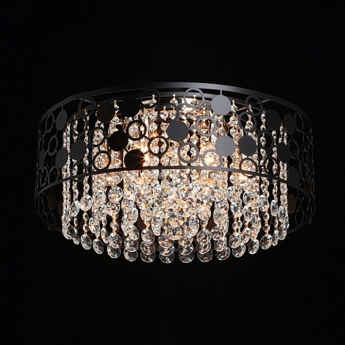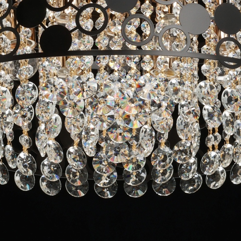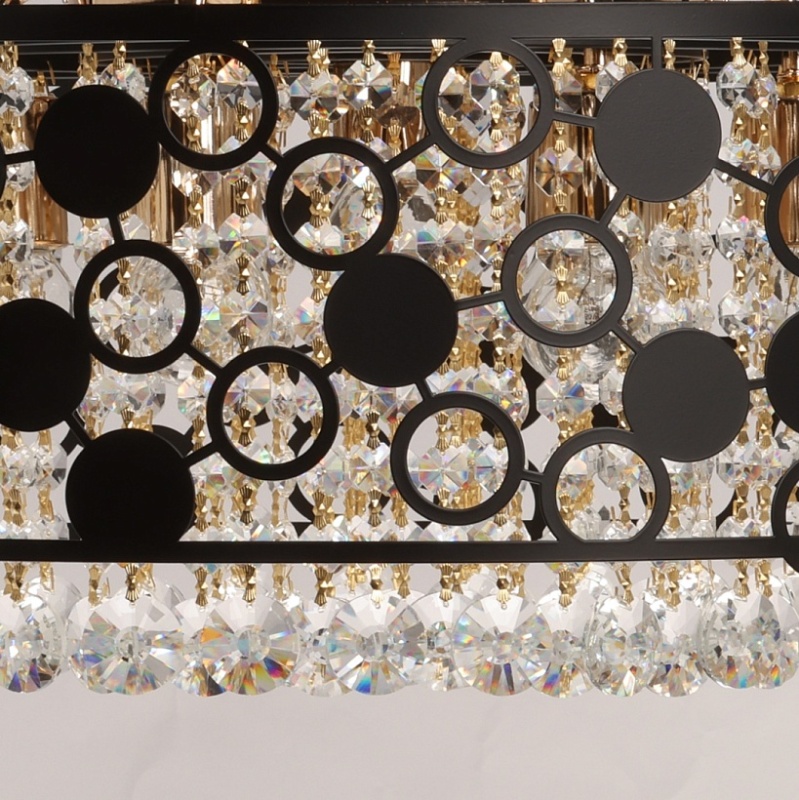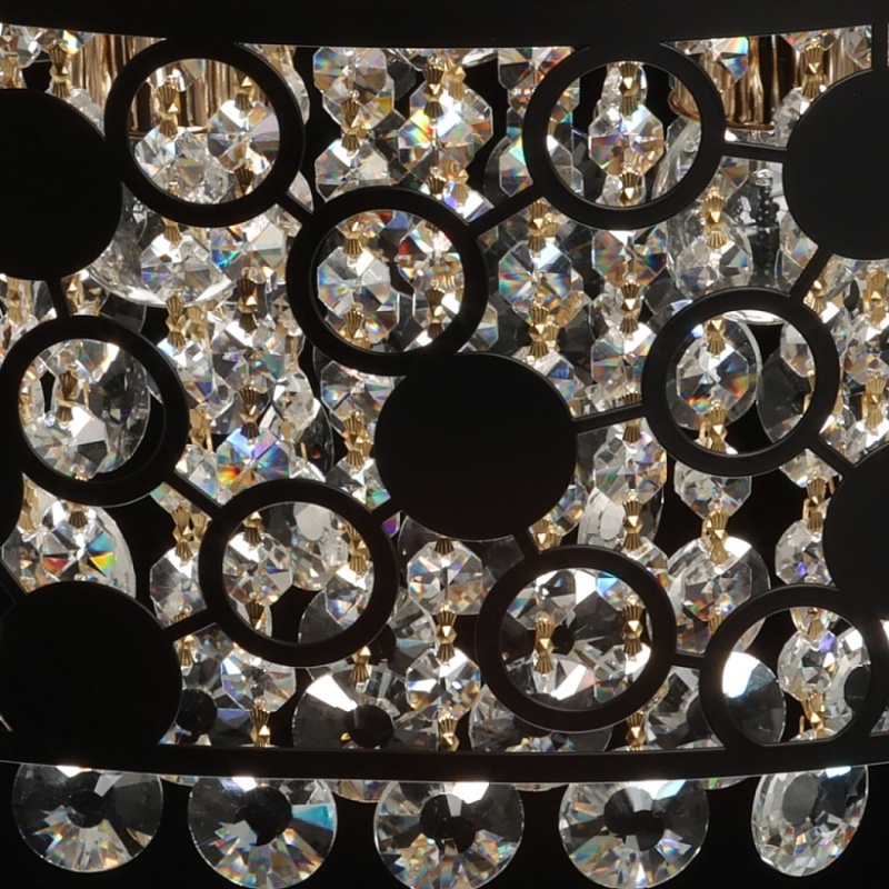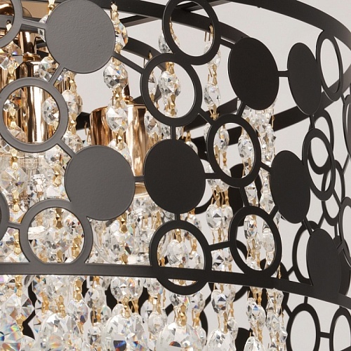 Металлическое основание светильника гальванизировано в цвет золота. Металлический плафон с геометричным орнаментом, выполненным по технологии лазерной резки, окрашен в черный цвет. Люстра декорирована прозрачным хрусталем круглой формы.