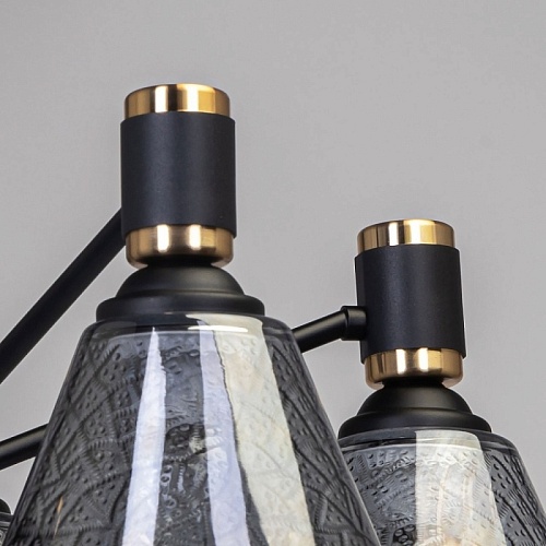 Металлическое основание потолочной люстры окрашено в черный цвет. Отдельные элементы основания гальванизированы в цвет золота. Потолочная люстра декорирована плафонами из фактурного стекла, гальванизированного в дымчатый металлизированный цвет.