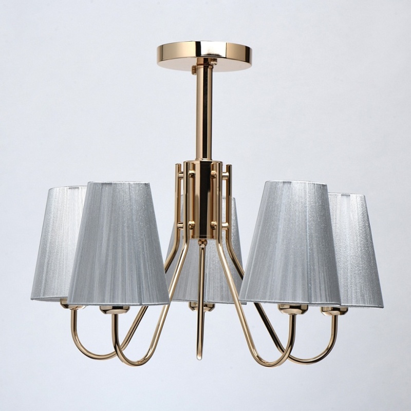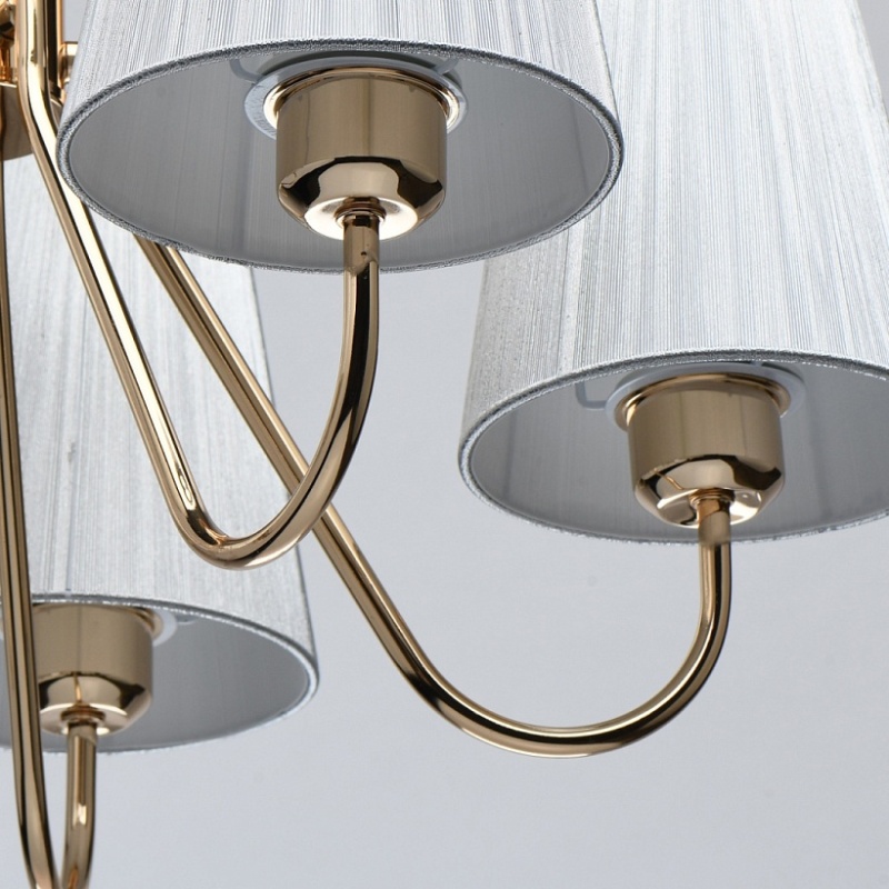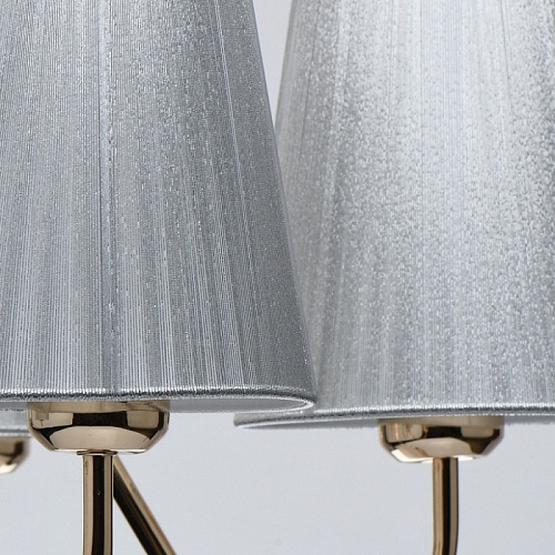 Металлическое основание светильника гальванизировано в цвет золота. Светильник декорирован двойными текстильными абажурами из нитей стального цвета и с термостойким акрилом внутри.