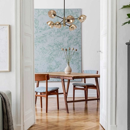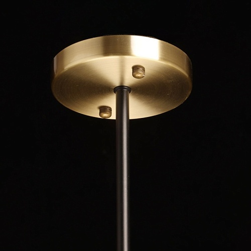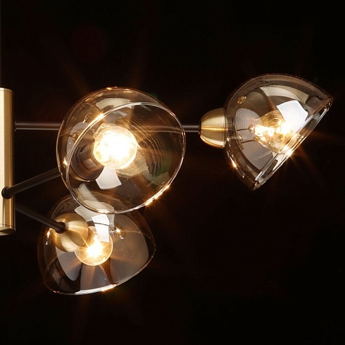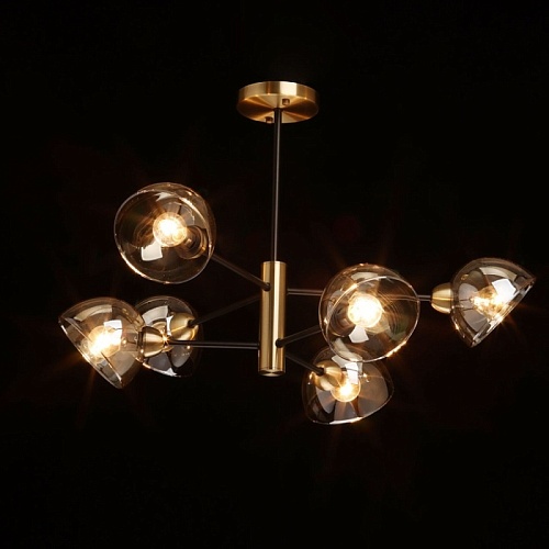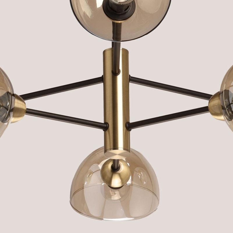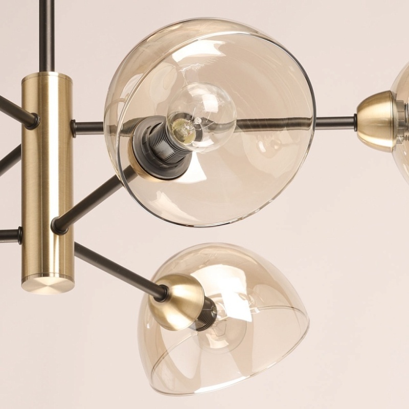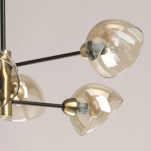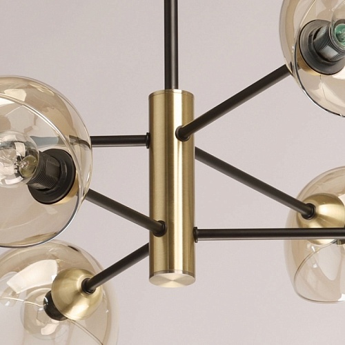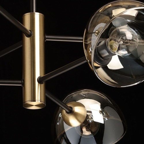 Металлическое основание люстры гальванизировано в цвет бронзы. Отдельные элементы основания окрашены в черный цвет. Люстра декорирована стеклянными плафонами, гальванизированными в цвет шампань.