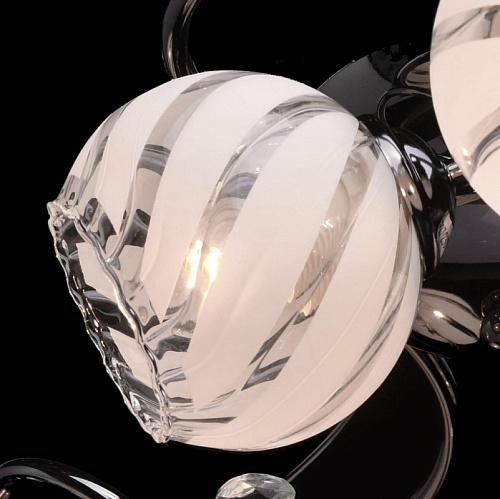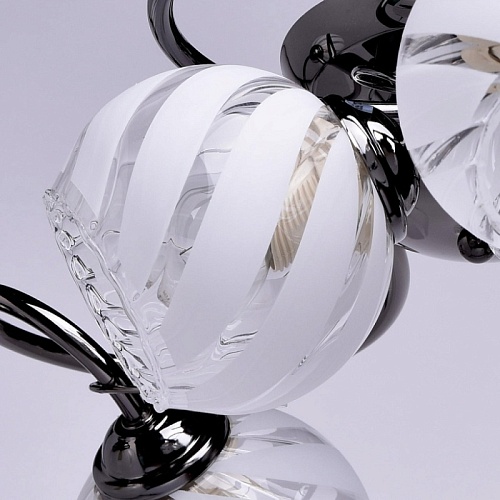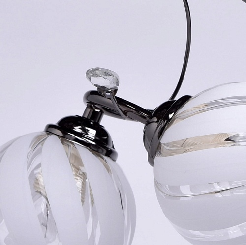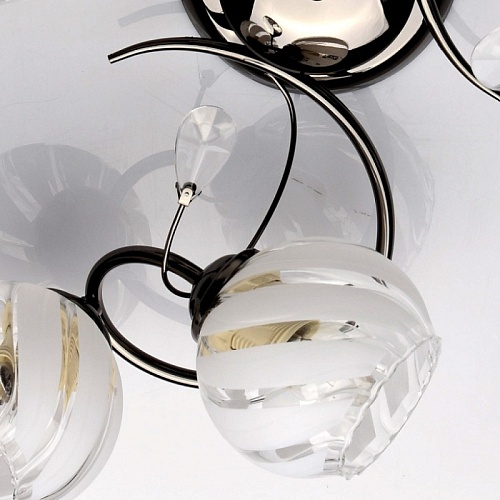 Основание светильника выполнено из металла, гальванизация в цвет никеля. Потолочная чаша, корпус, держатели плафонов изготовлены по технологии токарной обработки, рожки - прокат на роликовом станке с изменением диаметра рожка.Светильник декорирован стеклянными плафонами округлой формы, отлитыми в сложную форму, с последующим матированием внешней поверхности по трафарету. Края плафонов обработаны по технологии оплавления. Декоративные элементы на завитках из декоративного стекла в форме миндаля.