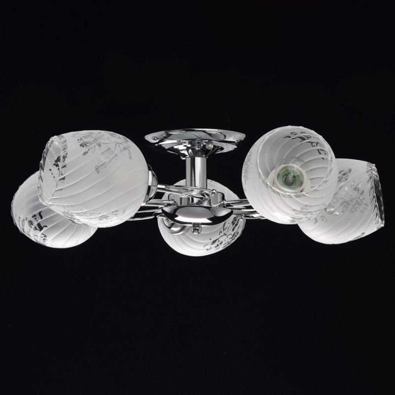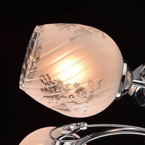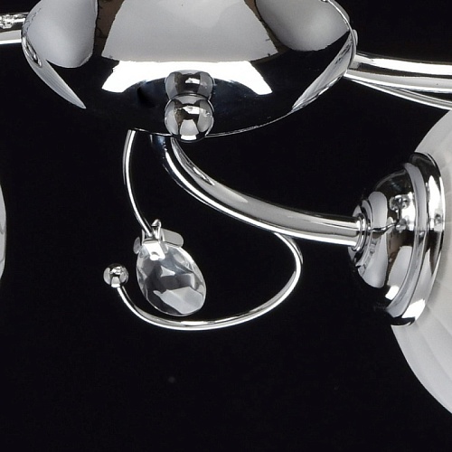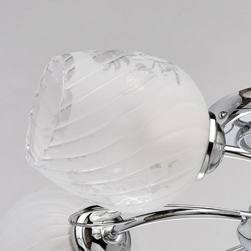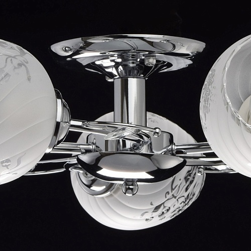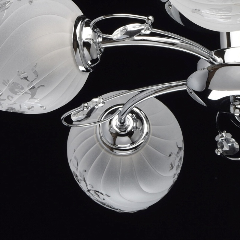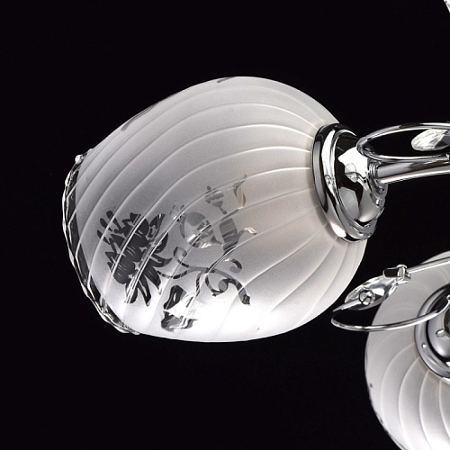 Основание светильника выполнено из металла, гальванизация в цвет хрома. Потолочная чаша, корпус, держатели плафонов изготовлены по технологии токарная обработка, рожки и завитки - прокат на роликовом станке.Светильник декорирован стеклянными плафонами, отлитыми в сложную форму, с последующим матированием внешней поверхности по трафарету. Края плафонов оплавлены.Декоративные элементы на завитках из декоративного стекла в форме миндаля.