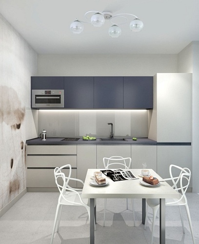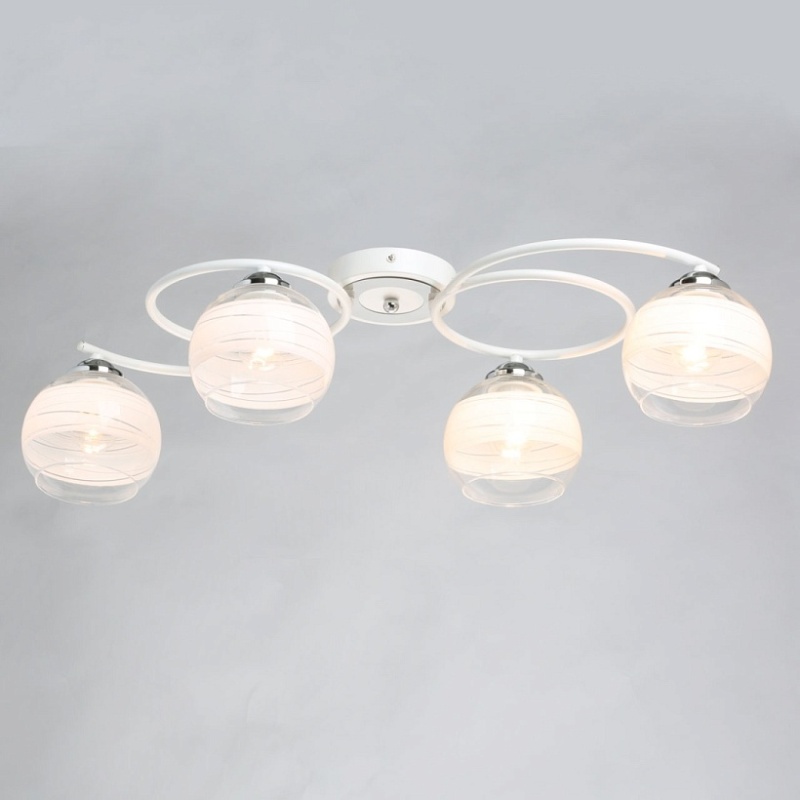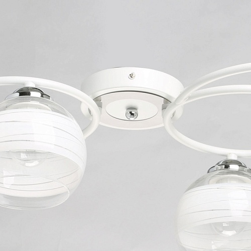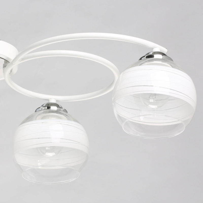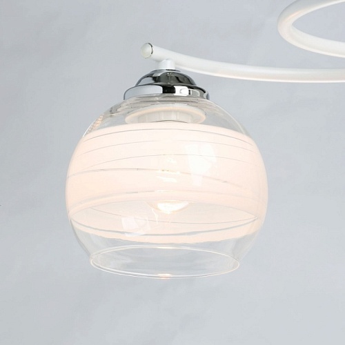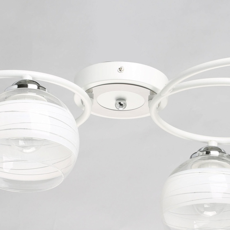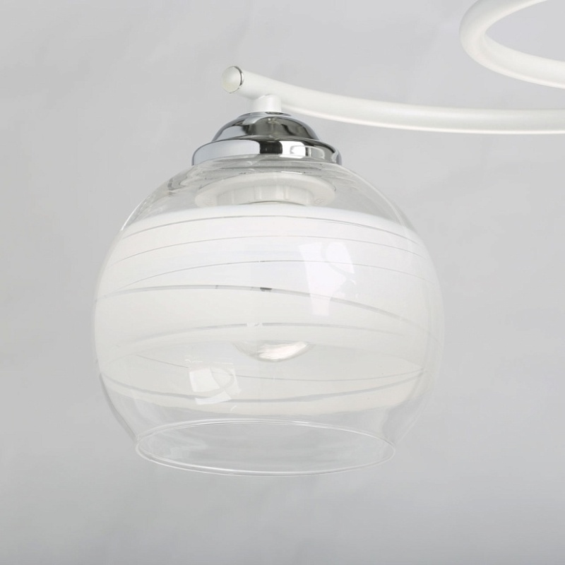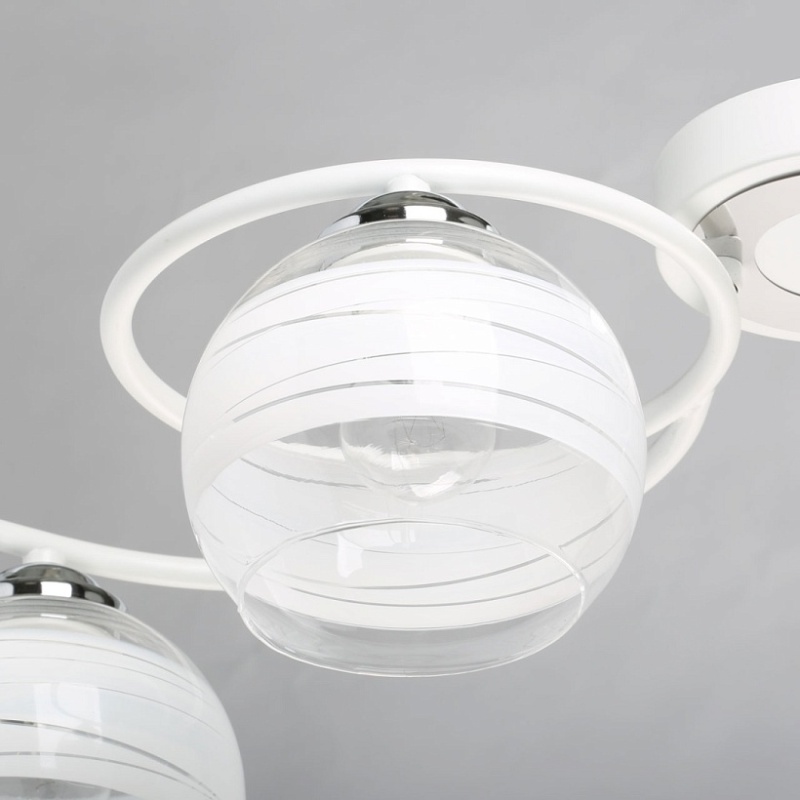 Металлическое основание потолочного светильника гальванизировано в цвет хрома. Отдельные элементы окрашены в белый цвет. Светильник декорирован выдувными вручную стеклянными плафонами. На плафоны нанесен рисунок в виде параллельных полос белого цвета.