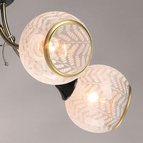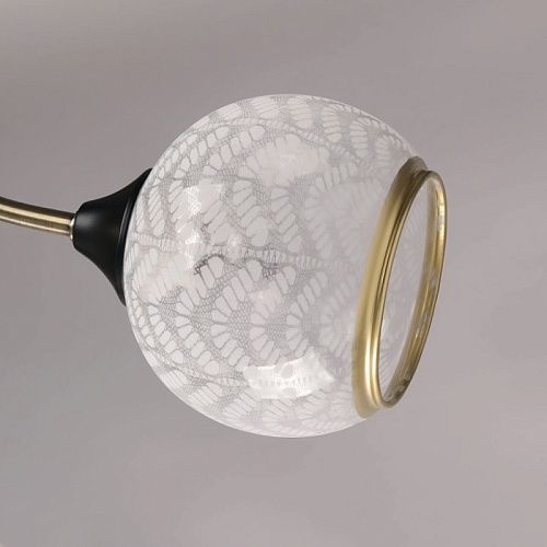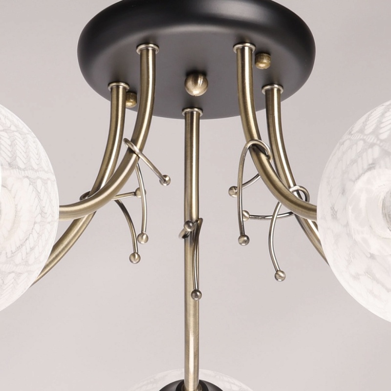 Металлическое основание подвесной люстры гальванизировано в цвет латуни. Отдельные элементы основания окрашены в черный цвет. Плафоны отлиты вручную и матированы по трафарету в растительный мотив. Края плафонов отделаны кантом цвета латуни.