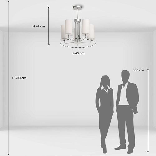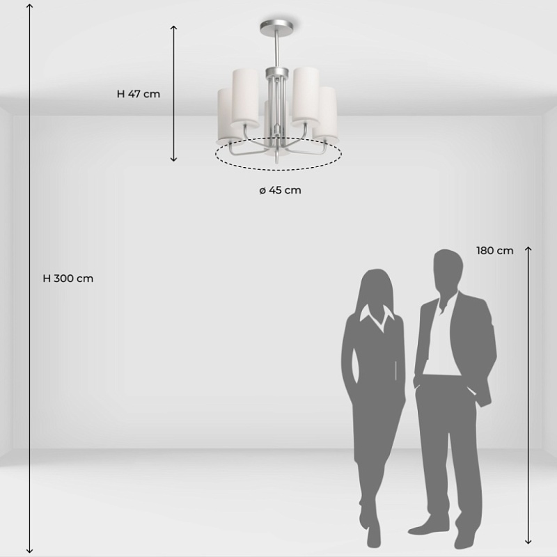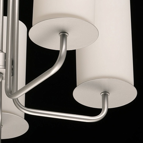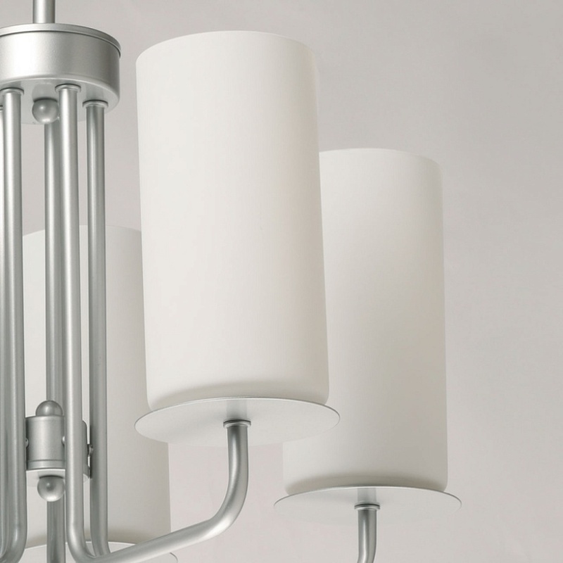 Металлическое основание люстры окрашено в цвет перламутрового серебра. Стеклянные плафоны окрашены в белый цвет.