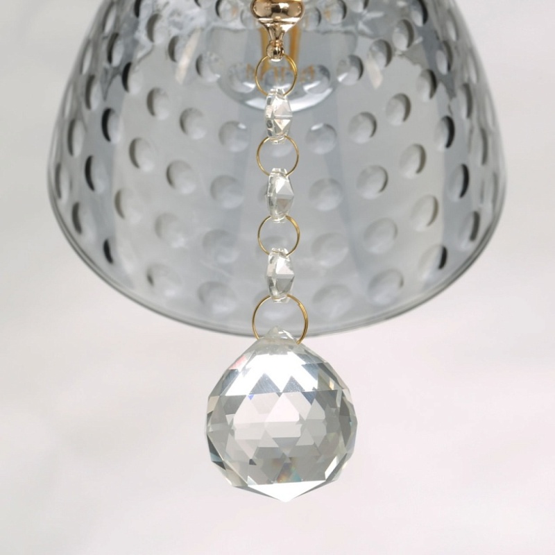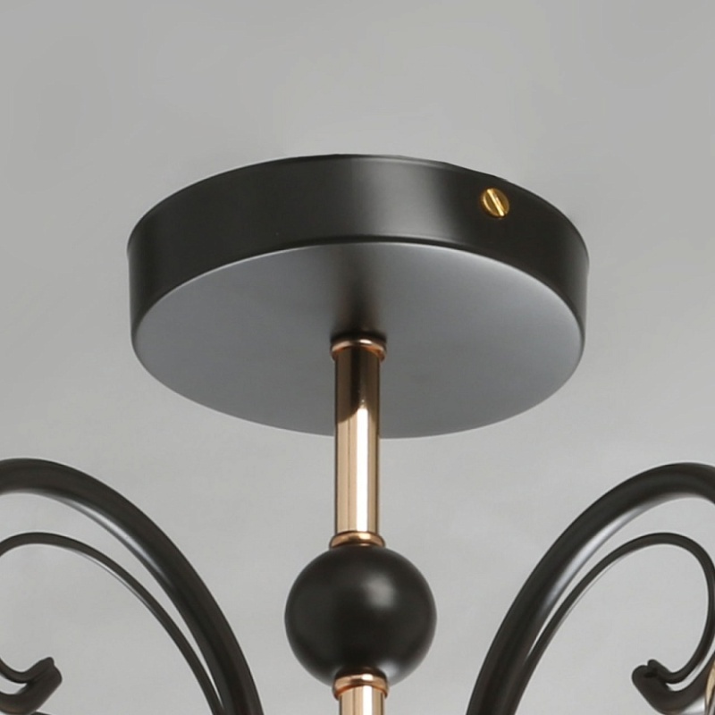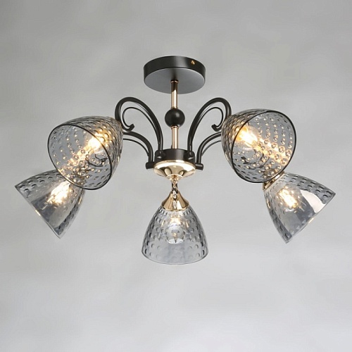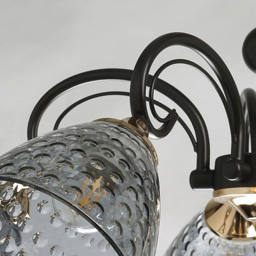 Металлическое основание потолочного светильника гальванизировано в цвет золота. Отдельные элементы окрашены в цвет кофе. Светильник декорирован выдувными в сложную форму стеклянными плафонами, гальванизированными в дымчатый цвет.