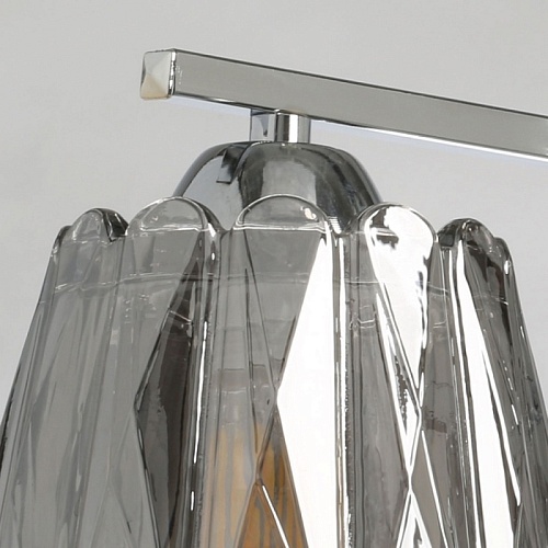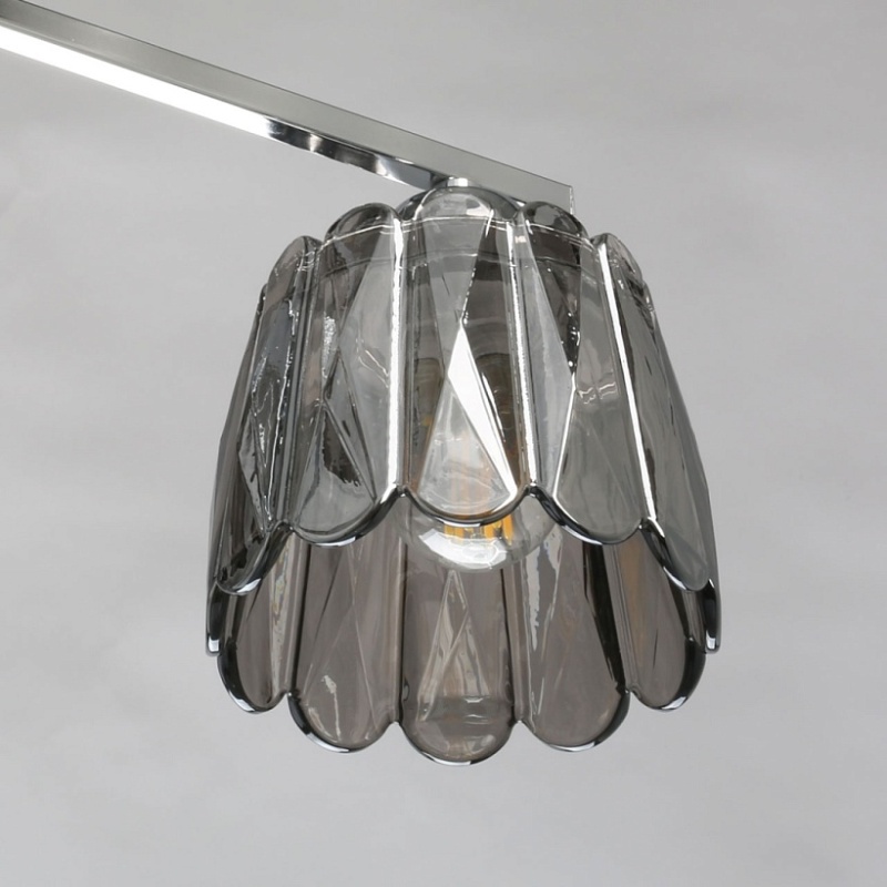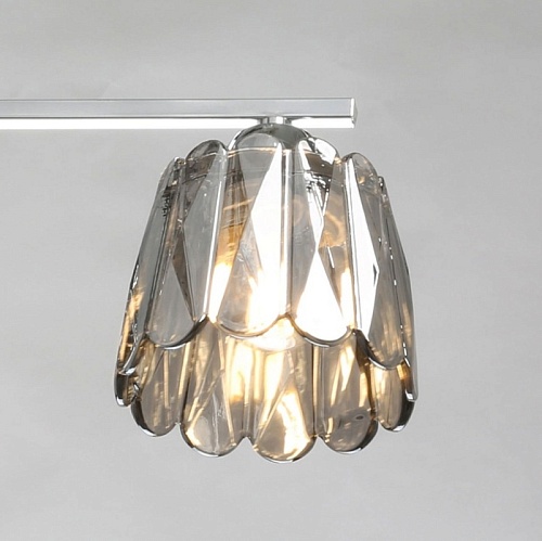 Металлическое основание потолочного светильника гальванизировано в цвет хрома. Стеклянные плафоны отлиты в сложную фактурную форму и гальванизированы в дымчатый цвет